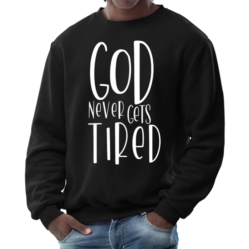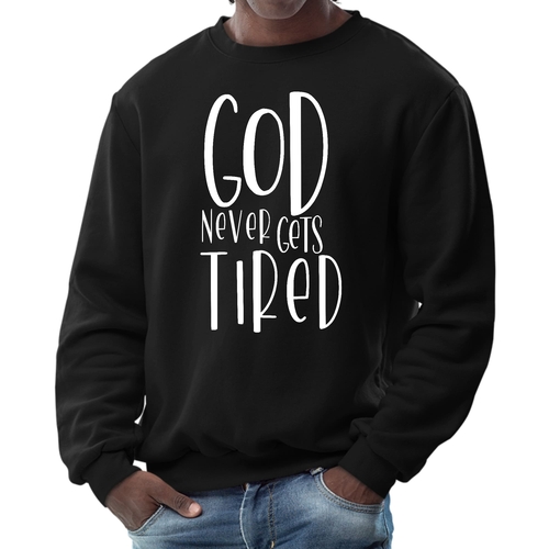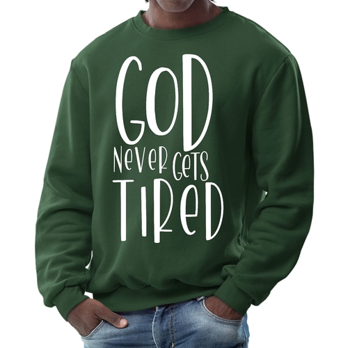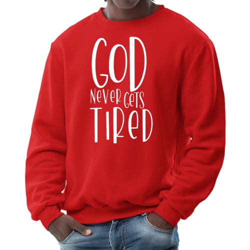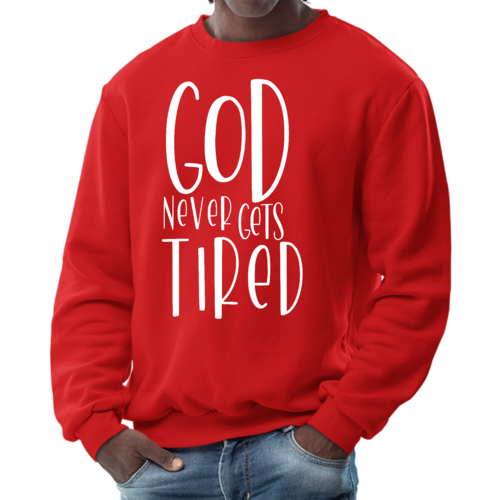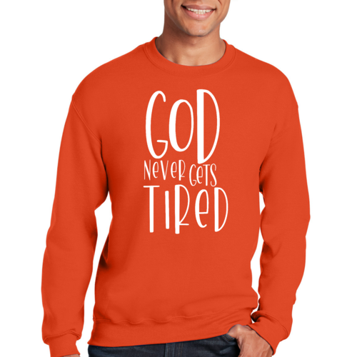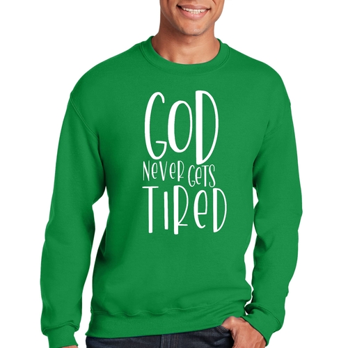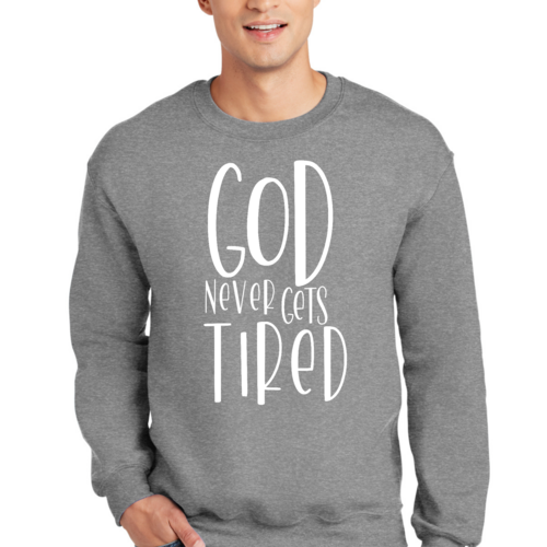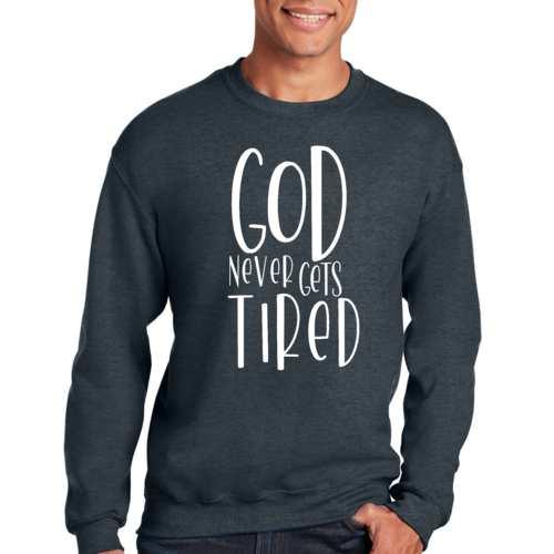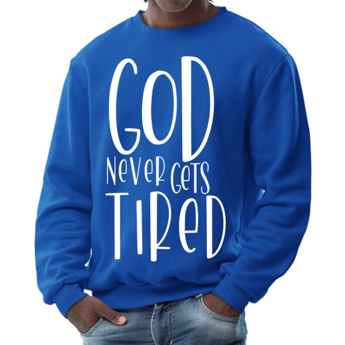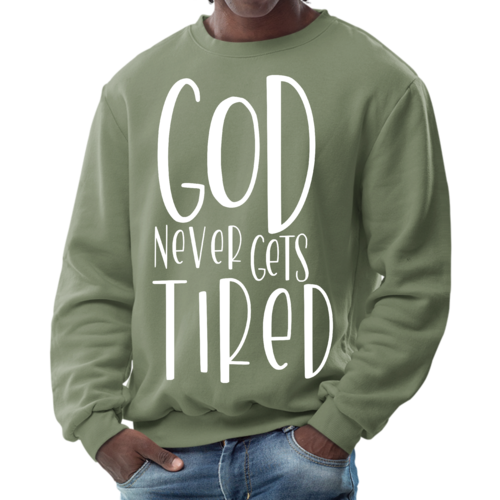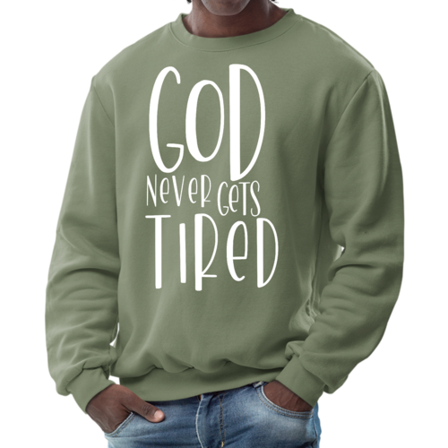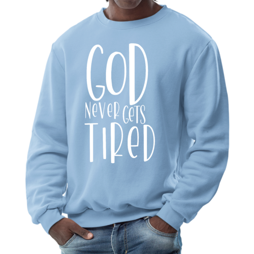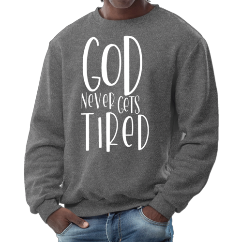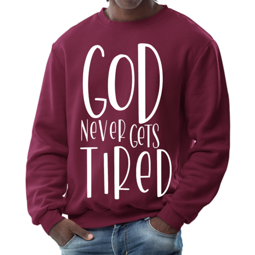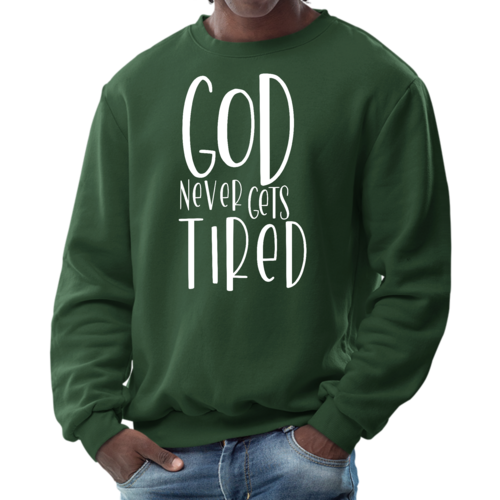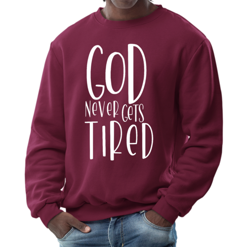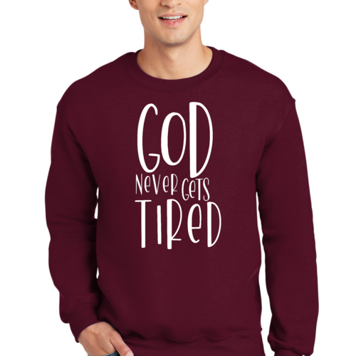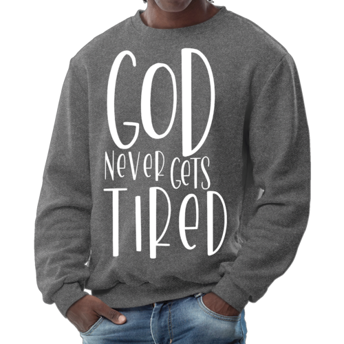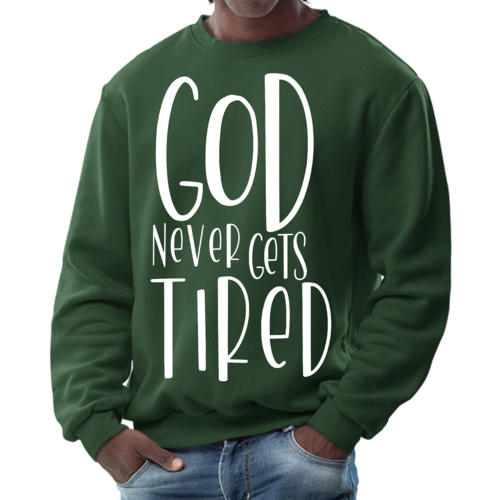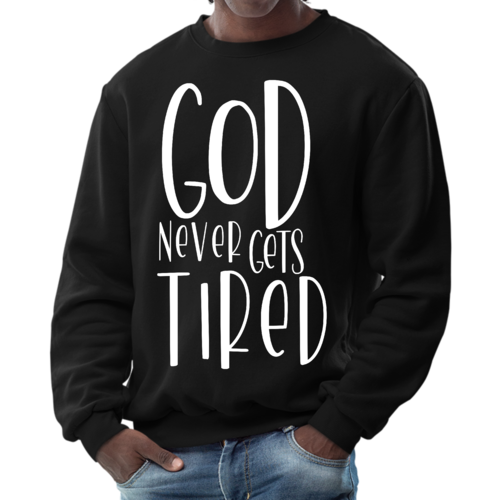 Featuring the uplifting phrase, 'God Never Gets Tired,' this sweatshirt serves as a daily reminder of resilience and faith. It's perfect for those who want to wear their beliefs proudly and inspire others around them. The motivational quote is printed in a stylish font, making it a standout piece in your wardrobe.