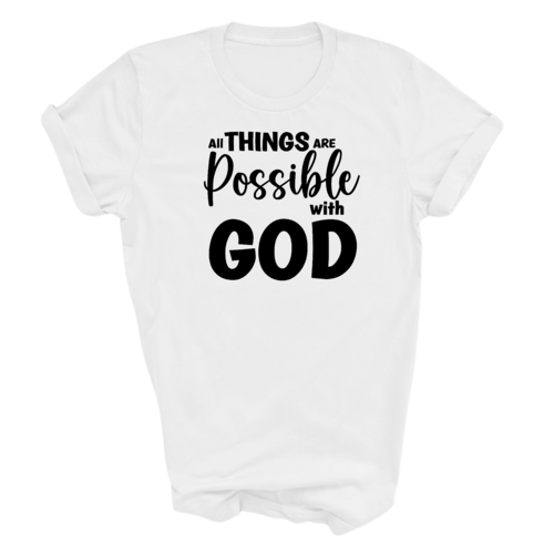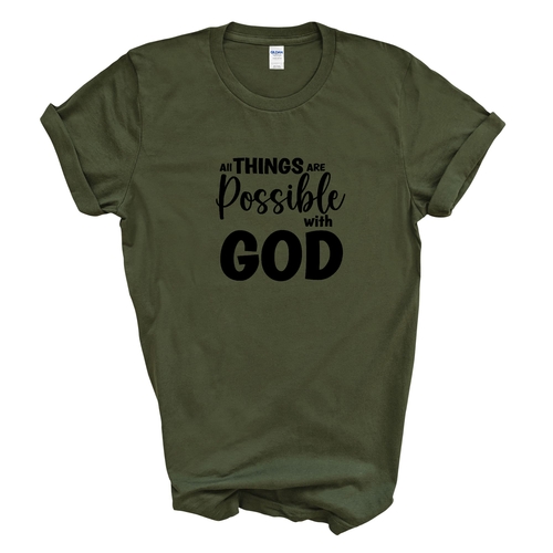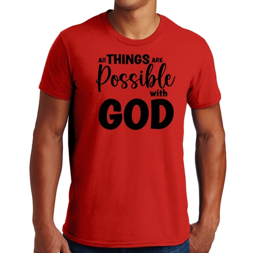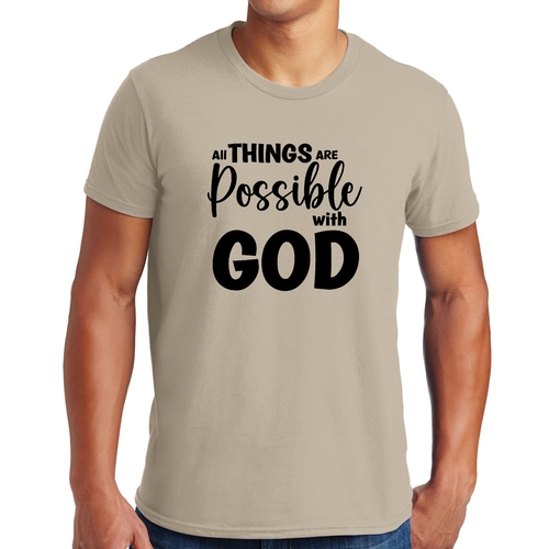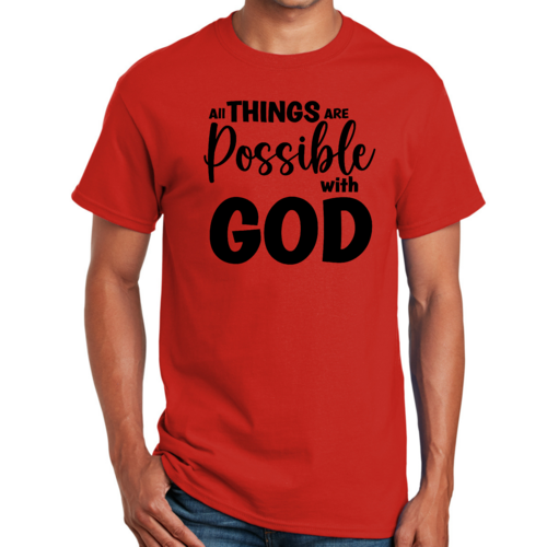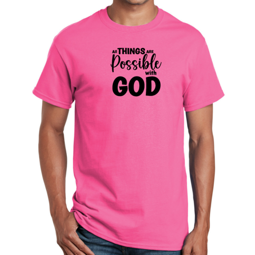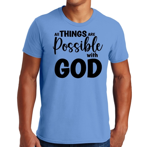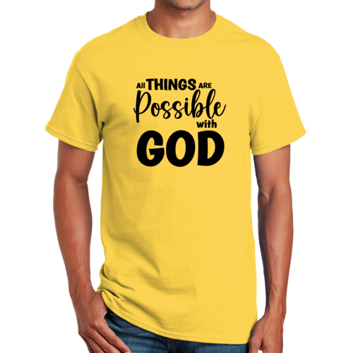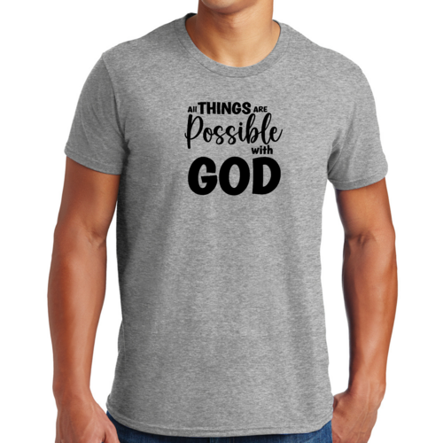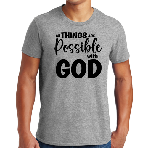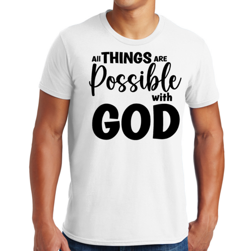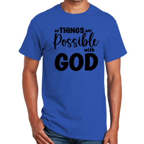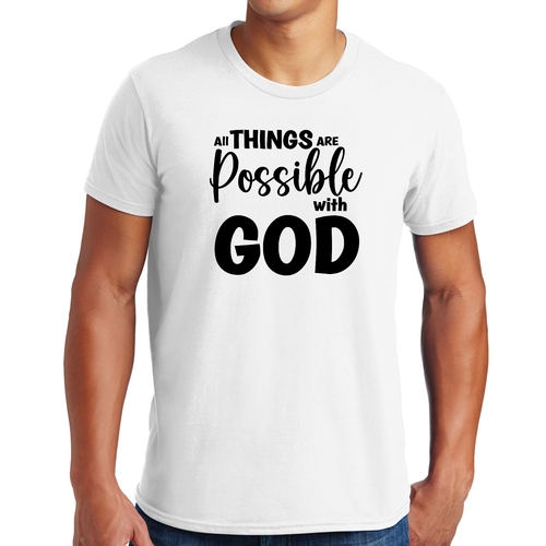 Introducing our Men's Graphic T-shirt featuring the inspiring message, 'All Things Are Possible with God.' This black tee is not just a piece of clothing; it's a statement of faith and positivity. Crafted from high-quality, preshrunk cotton, this shirt ensures that you stay comfortable throughout the day while retaining its shape and softness even after multiple washes.