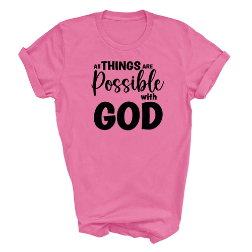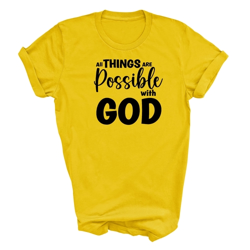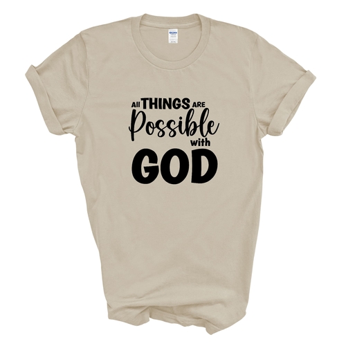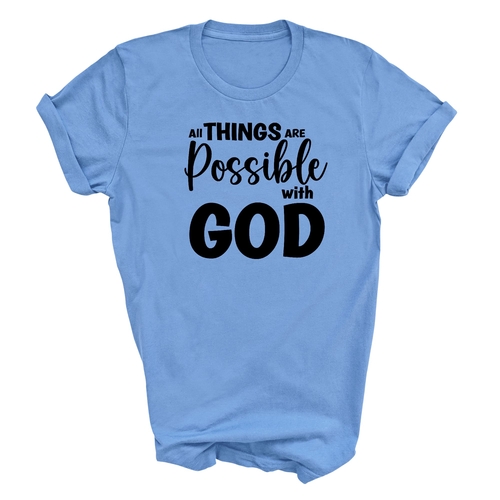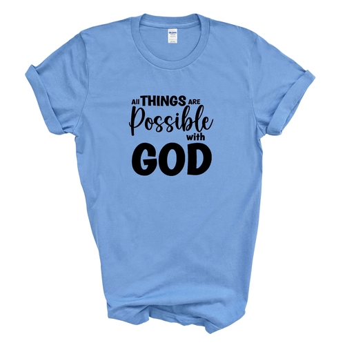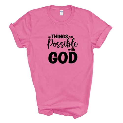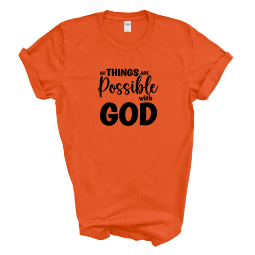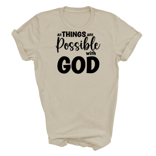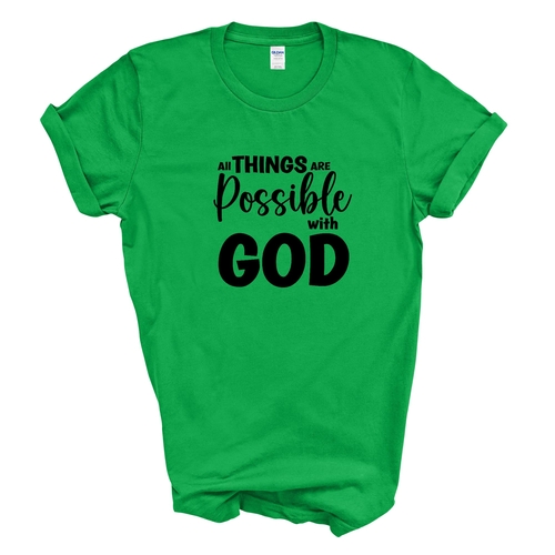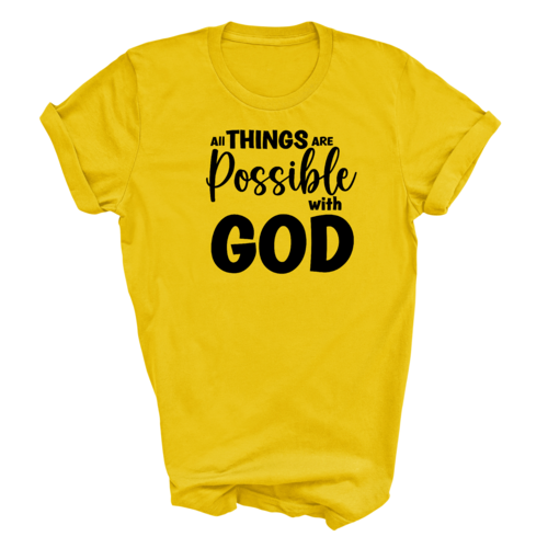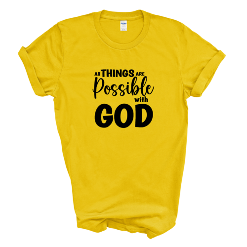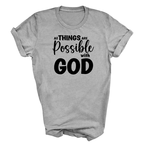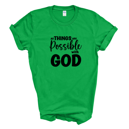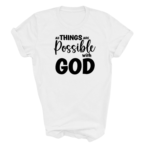Introducing our Men's Graphic T-shirt featuring the inspiring message, 'All Things Are Possible with God.' This black tee is not just a piece of clothing; it's a statement of faith and positivity. Crafted from high-quality, preshrunk cotton, this shirt ensures that you stay comfortable throughout the day while retaining its shape and softness even after multiple washes.