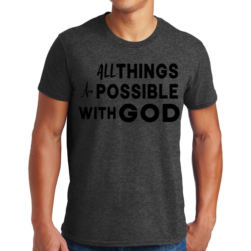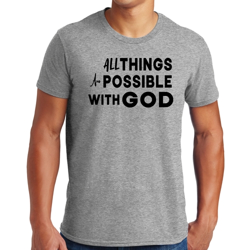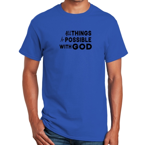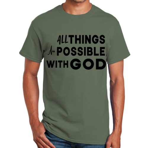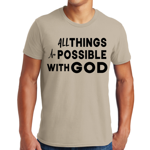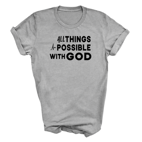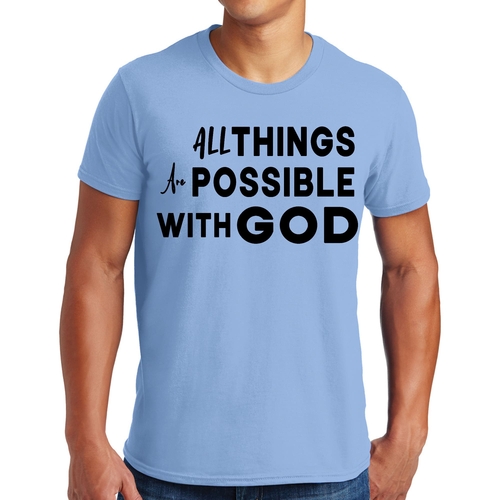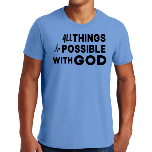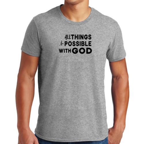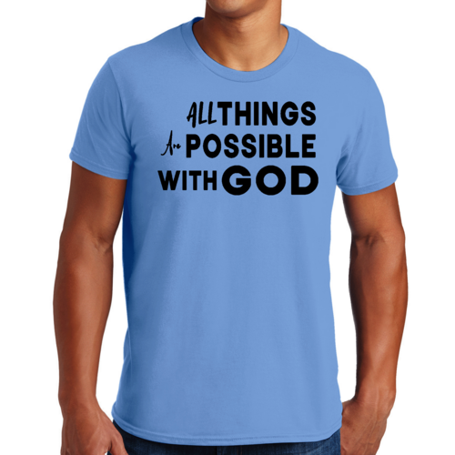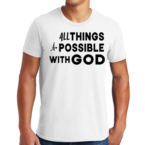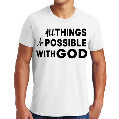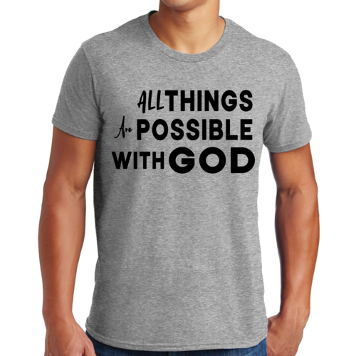 This t-shirt is perfect for various occasions, whether you're attending a casual gathering, running errands, or simply lounging at home. The uplifting message 'All Things are Possible with God' makes it a great conversation starter and a wonderful way to express your beliefs. Pair it with jeans, shorts, or joggers for a laid-back look that is both comfortable and stylish.