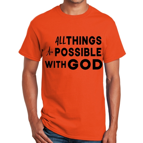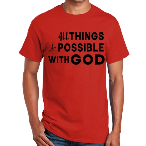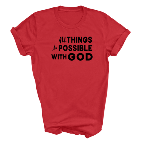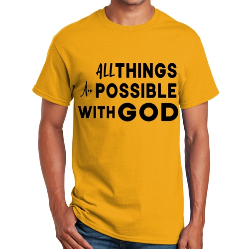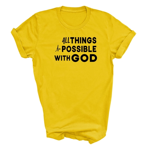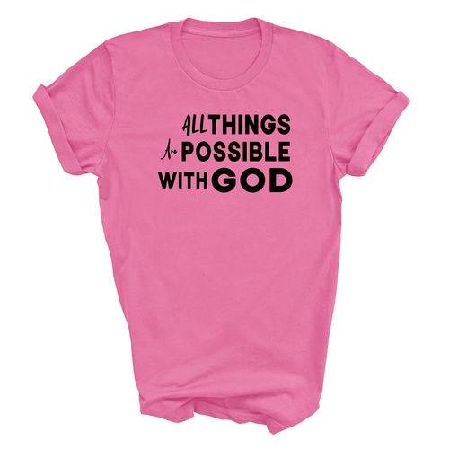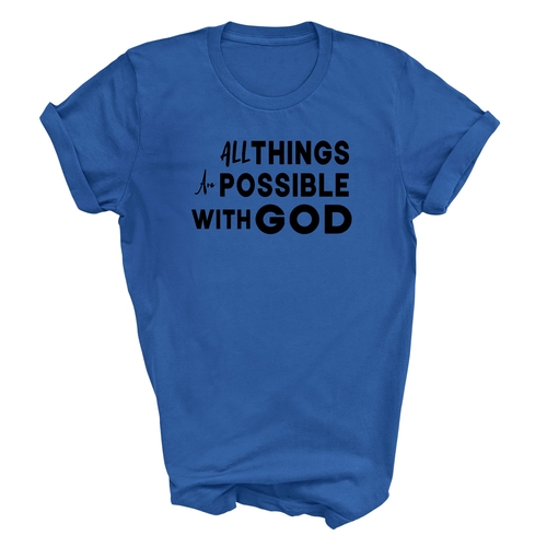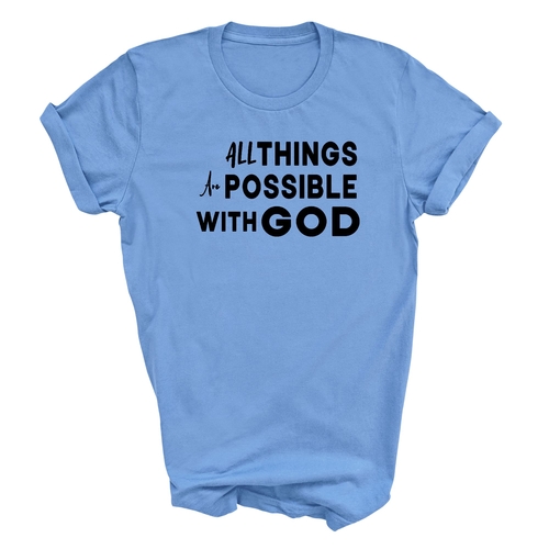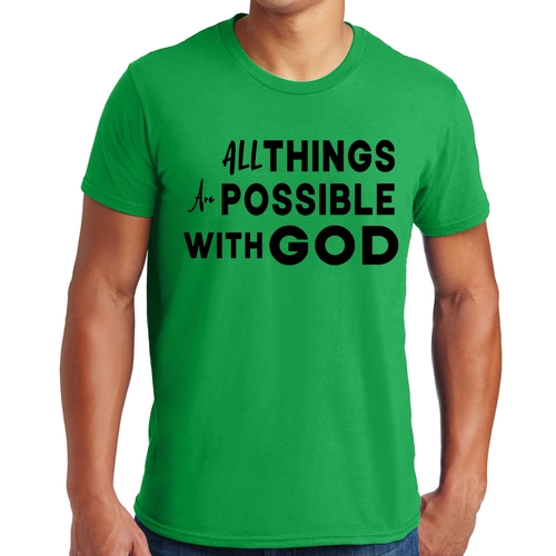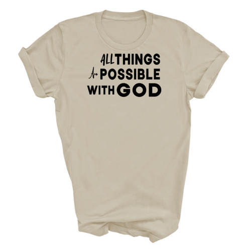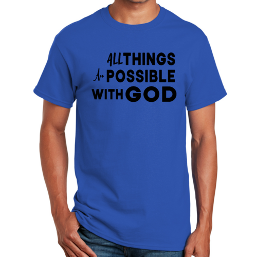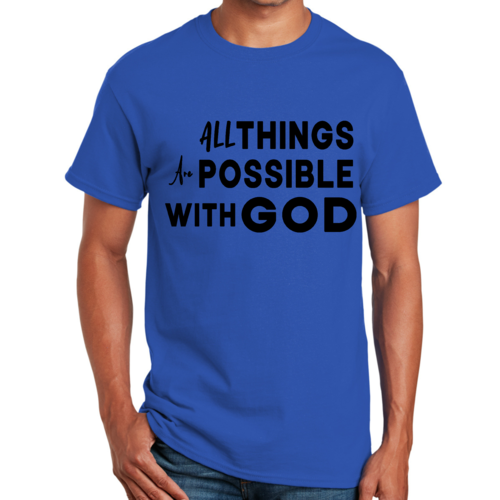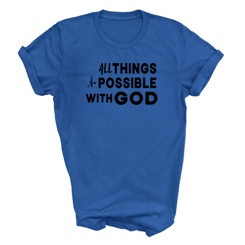 This t-shirt is perfect for various occasions, whether you're attending a casual gathering, running errands, or simply lounging at home. The uplifting message 'All Things are Possible with God' makes it a great conversation starter and a wonderful way to express your beliefs. Pair it with jeans, shorts, or joggers for a laid-back look that is both comfortable and stylish.