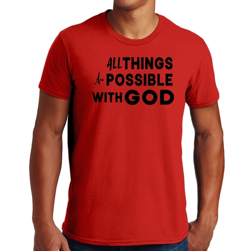 Introducing our Men's Graphic T-shirt featuring the inspiring message 'All Things are Possible with God' in a stylish black design. This t-shirt is not just a piece of clothing; it's a statement of faith and positivity that resonates with many. Crafted from high-quality preshrunk cotton, this shirt ensures that you enjoy both comfort and durability, making it a perfect addition to your wardrobe.