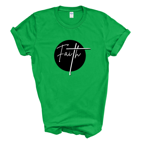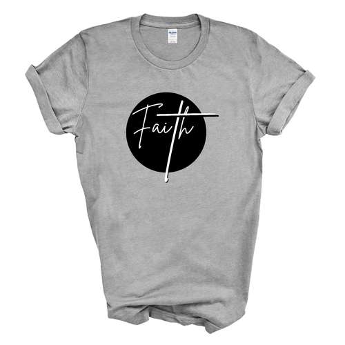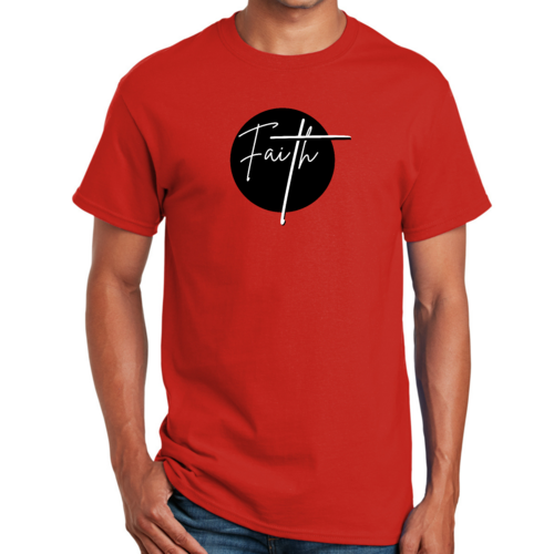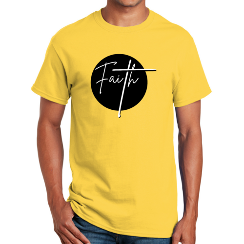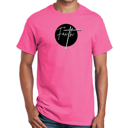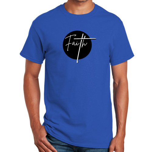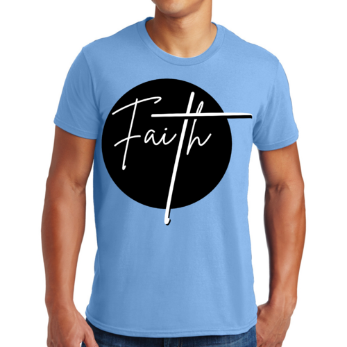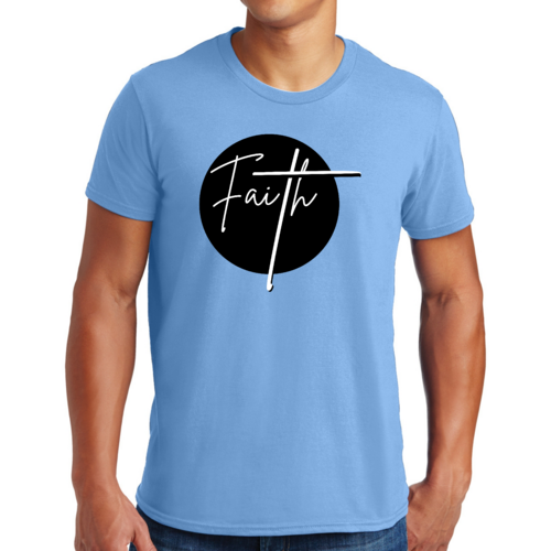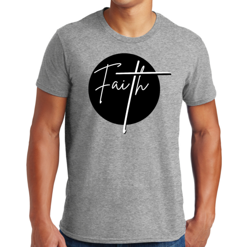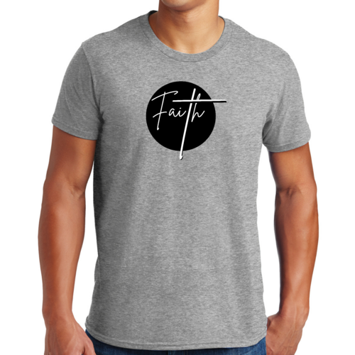 Men's black graphic t-shirt featuring a white Faith print, made from soft preshrunk cotton, showcasing a classic crewneck design.