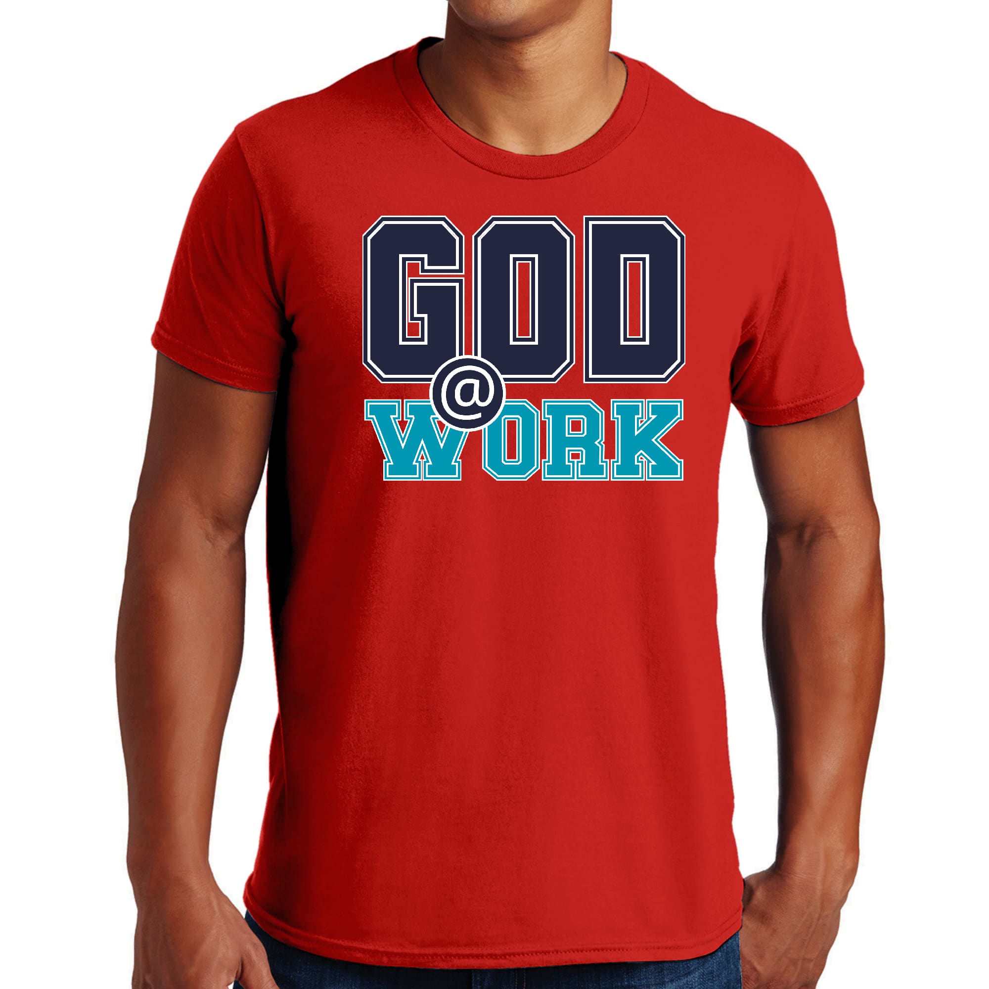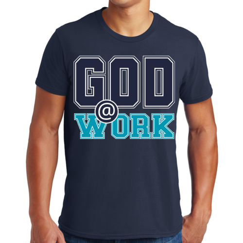 Introducing our Men's Graphic T-shirt featuring the inspiring message 'God @ Work' in a stylish Navy Blue and Blue Green print. This t-shirt is designed for comfort and durability, making it a perfect addition to your casual wardrobe. Crafted from soft, preshrunk cotton, this shirt ensures that you enjoy a comfortable fit that retains its shape and softness even after multiple washes.