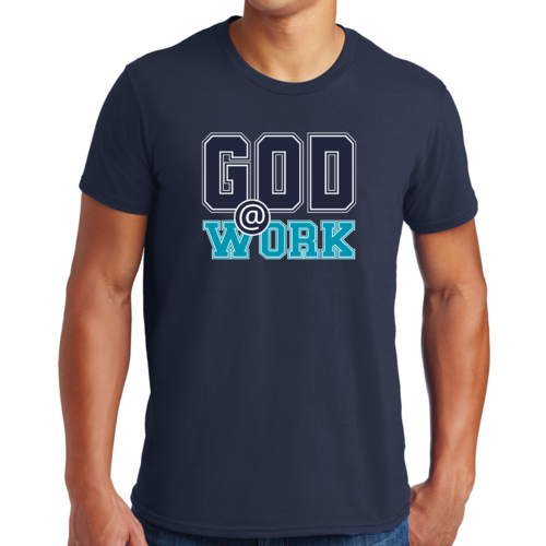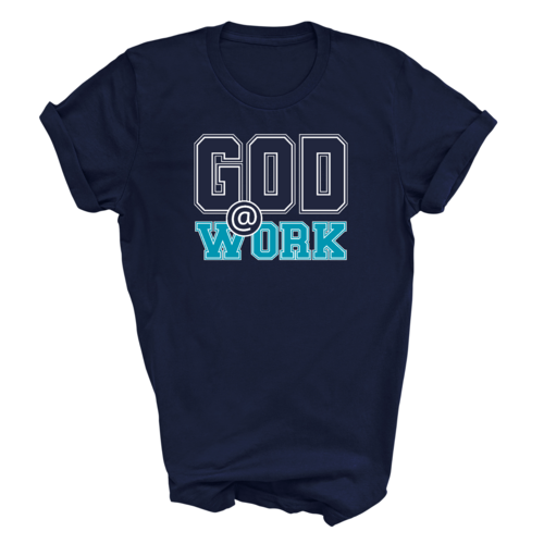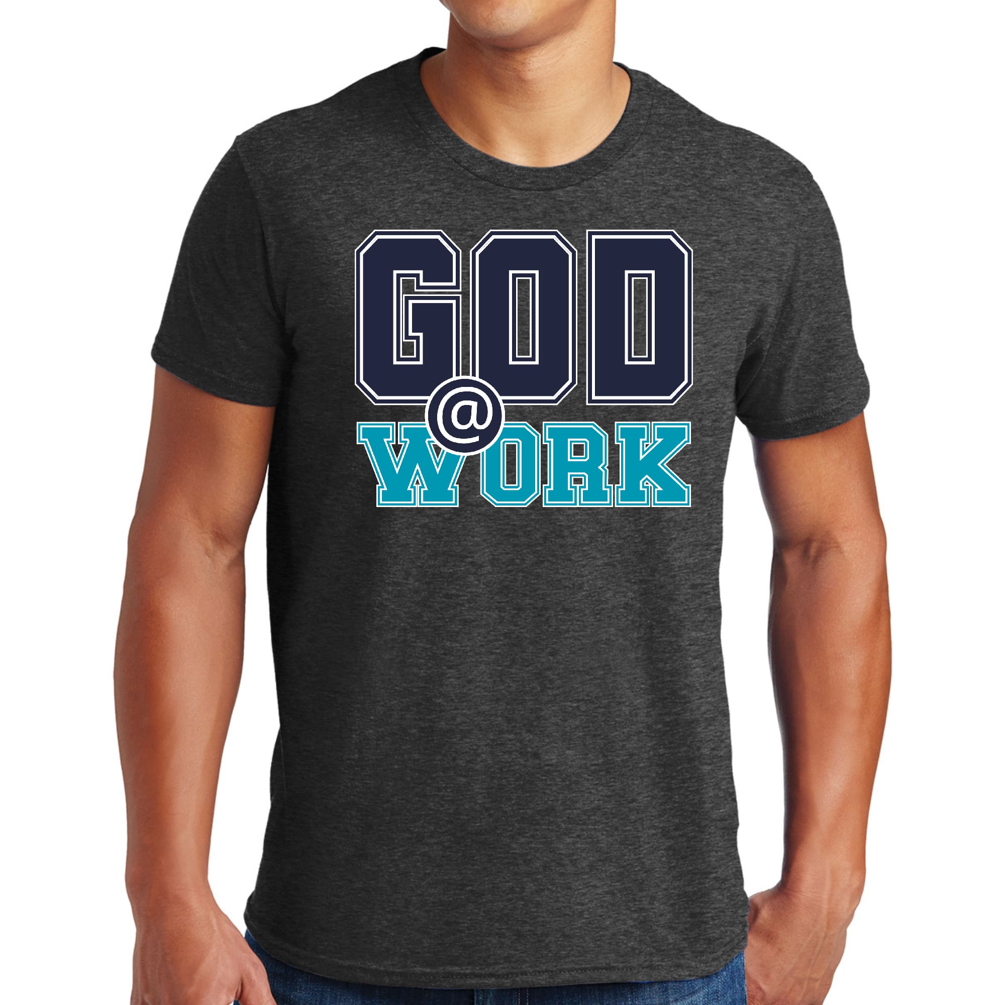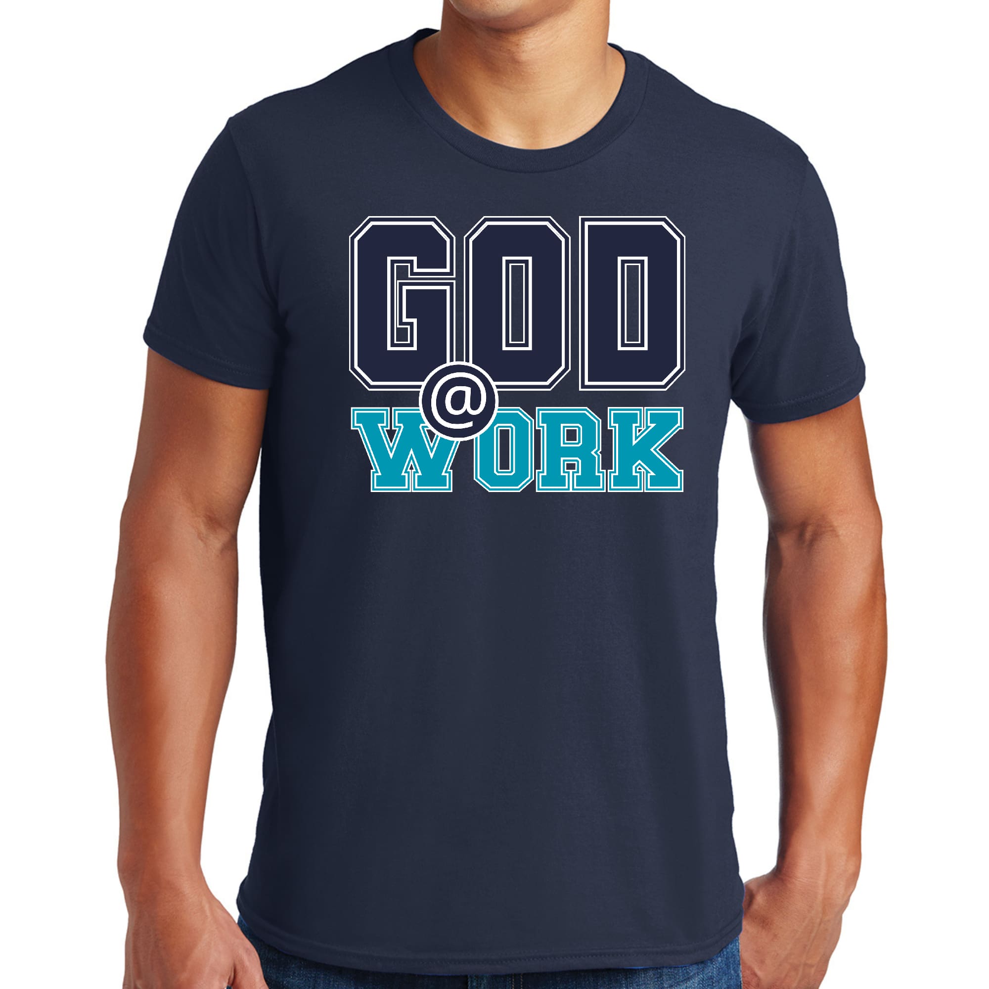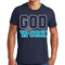 Men's Graphic T-shirt in Navy Blue with Blue Green 'God @ Work' print, showcasing a comfortable fit and stylish design.