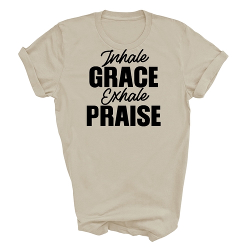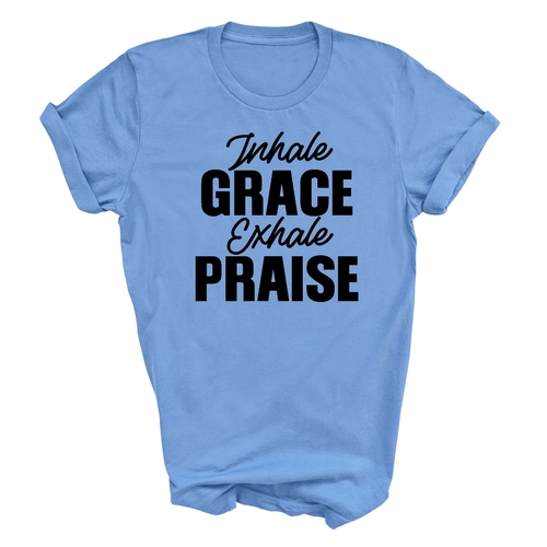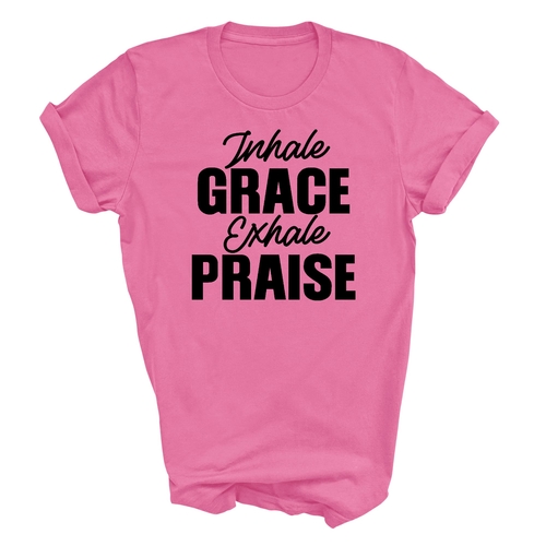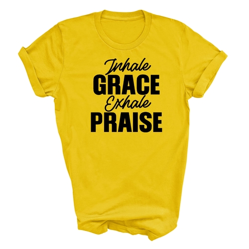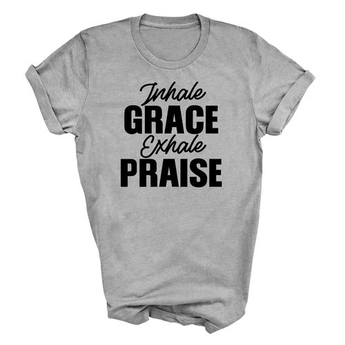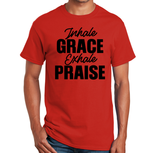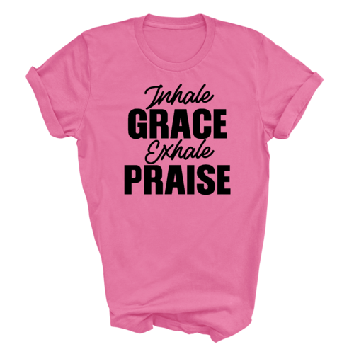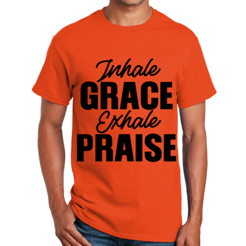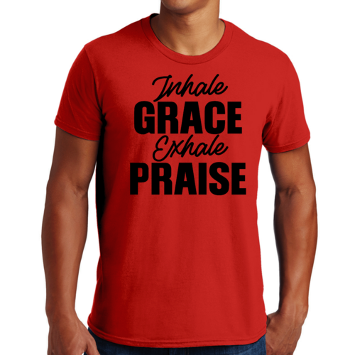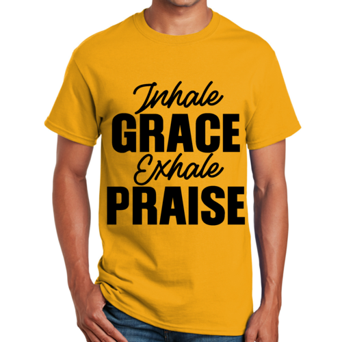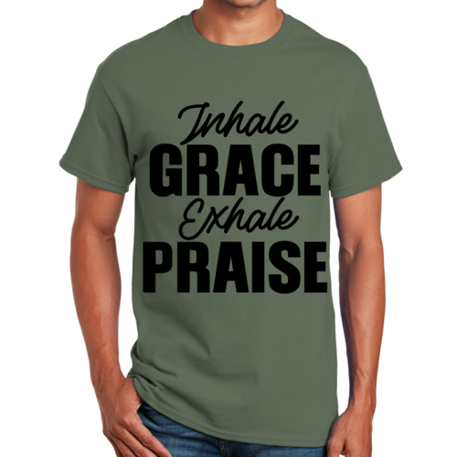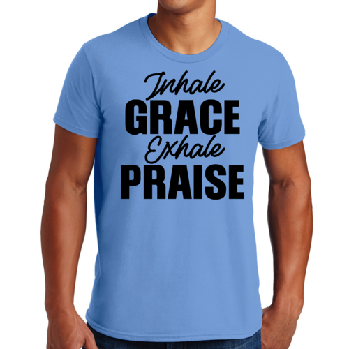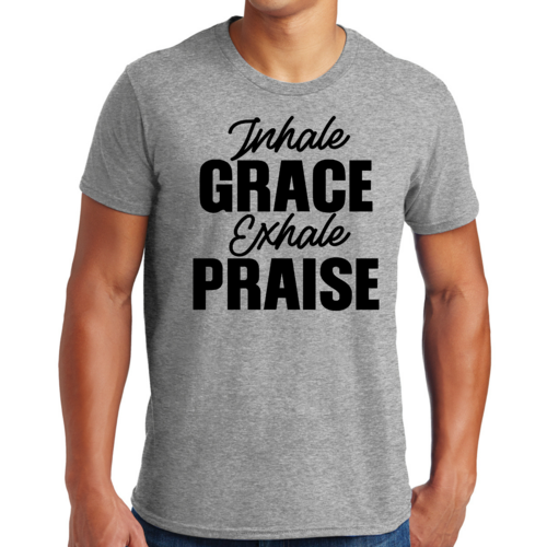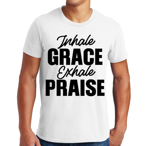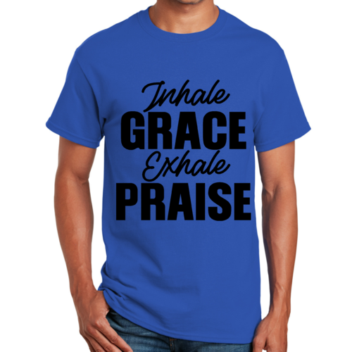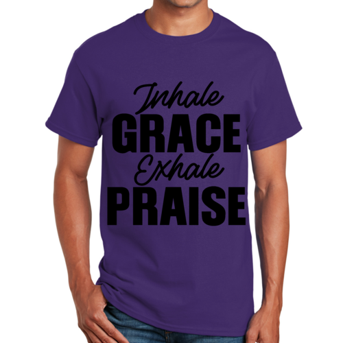 The 'Inhale Grace Exhale Praise' graphic adds a unique touch to this classic black t-shirt. It serves as a reminder to embrace positivity and gratitude in your daily life. Pair it with jeans, shorts, or joggers for a laid-back look, or dress it up with a blazer for a more polished appearance. This t-shirt is versatile enough to suit any occasion.