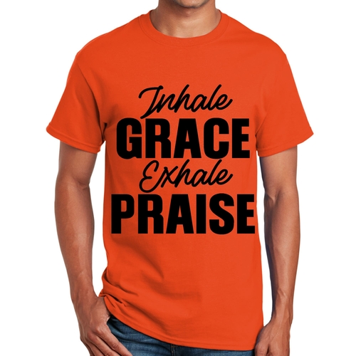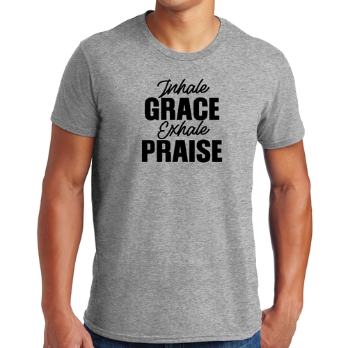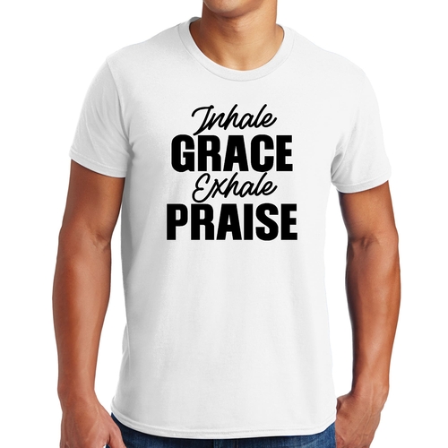 Introducing our Men's Graphic T-shirt featuring the inspiring phrase 'Inhale Grace Exhale Praise'. This stylish black illustration tee is designed for both comfort and durability, making it a perfect addition to any wardrobe. Crafted from high-quality cotton, this t-shirt offers a soft feel against the skin, ensuring you stay comfortable throughout the day.
