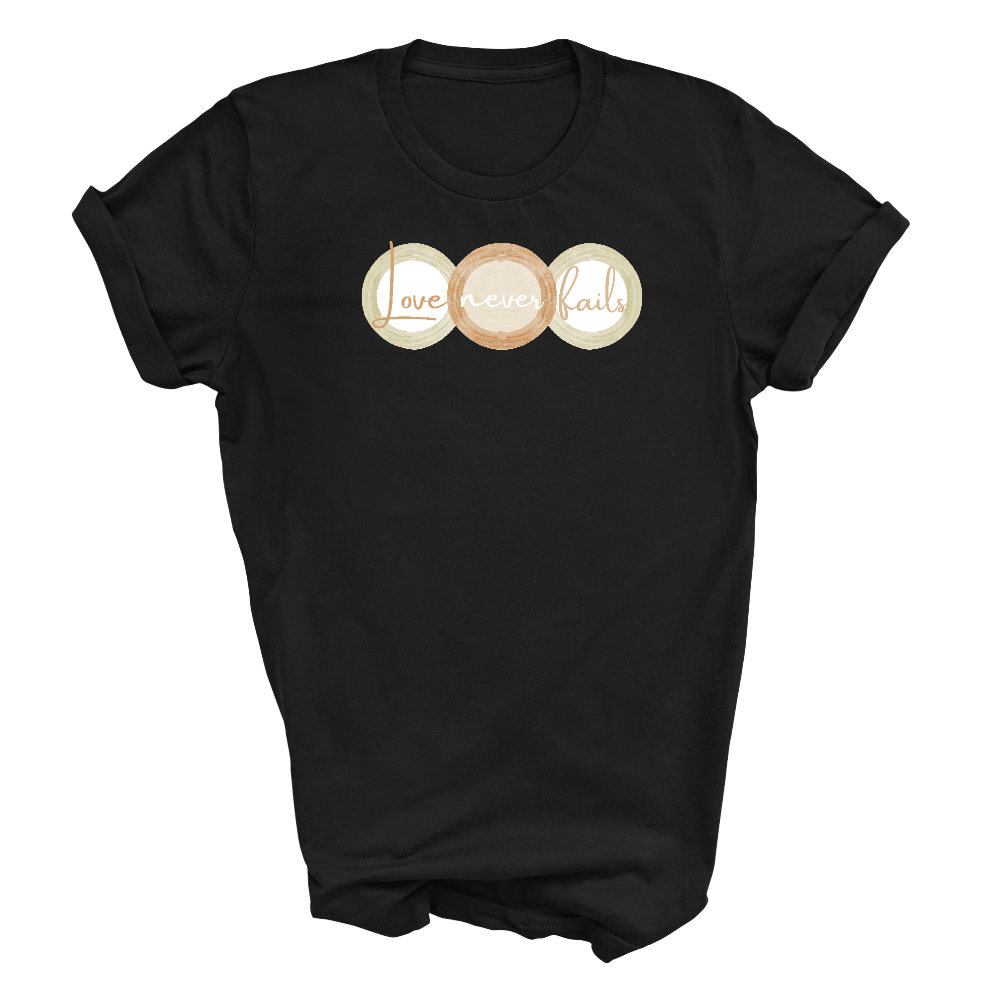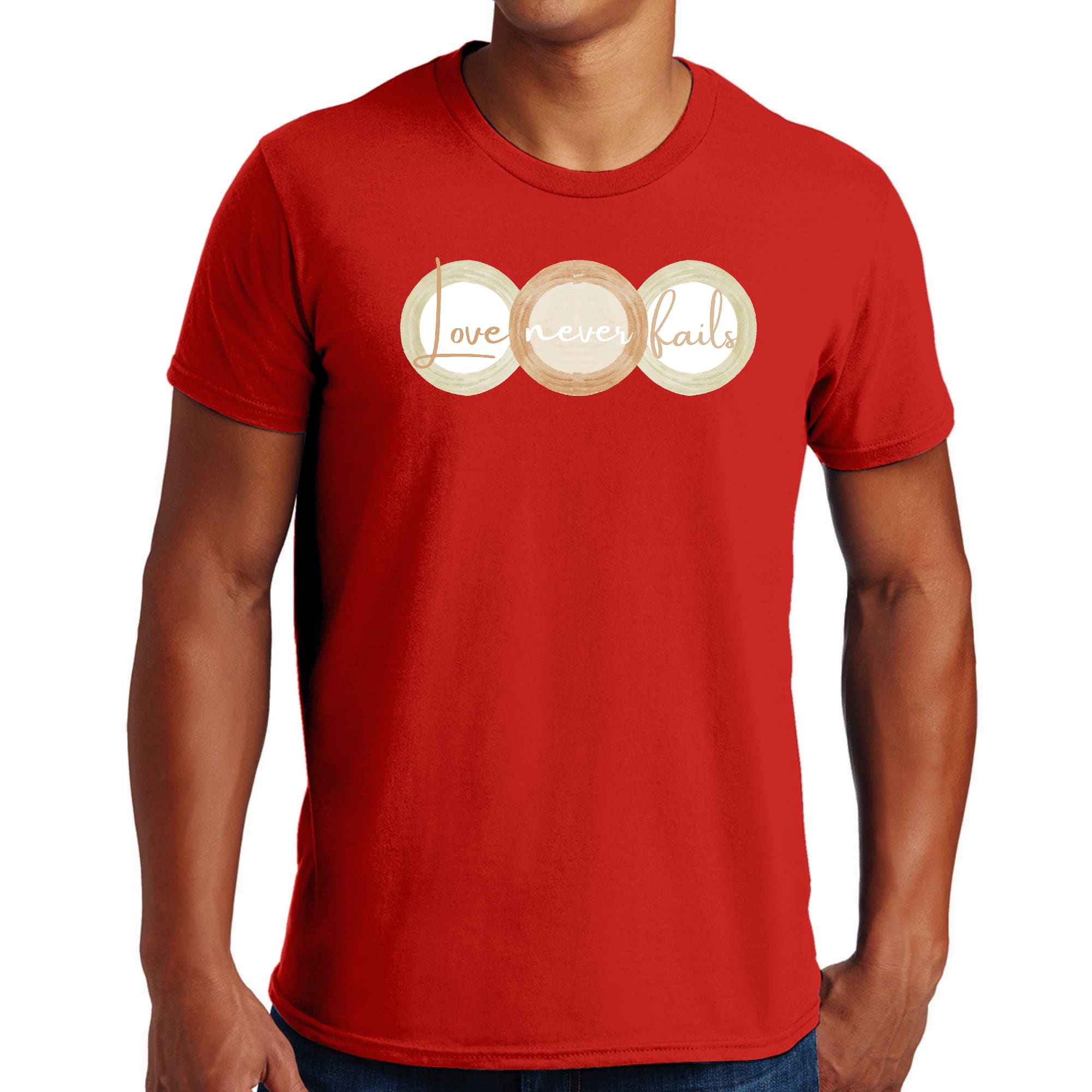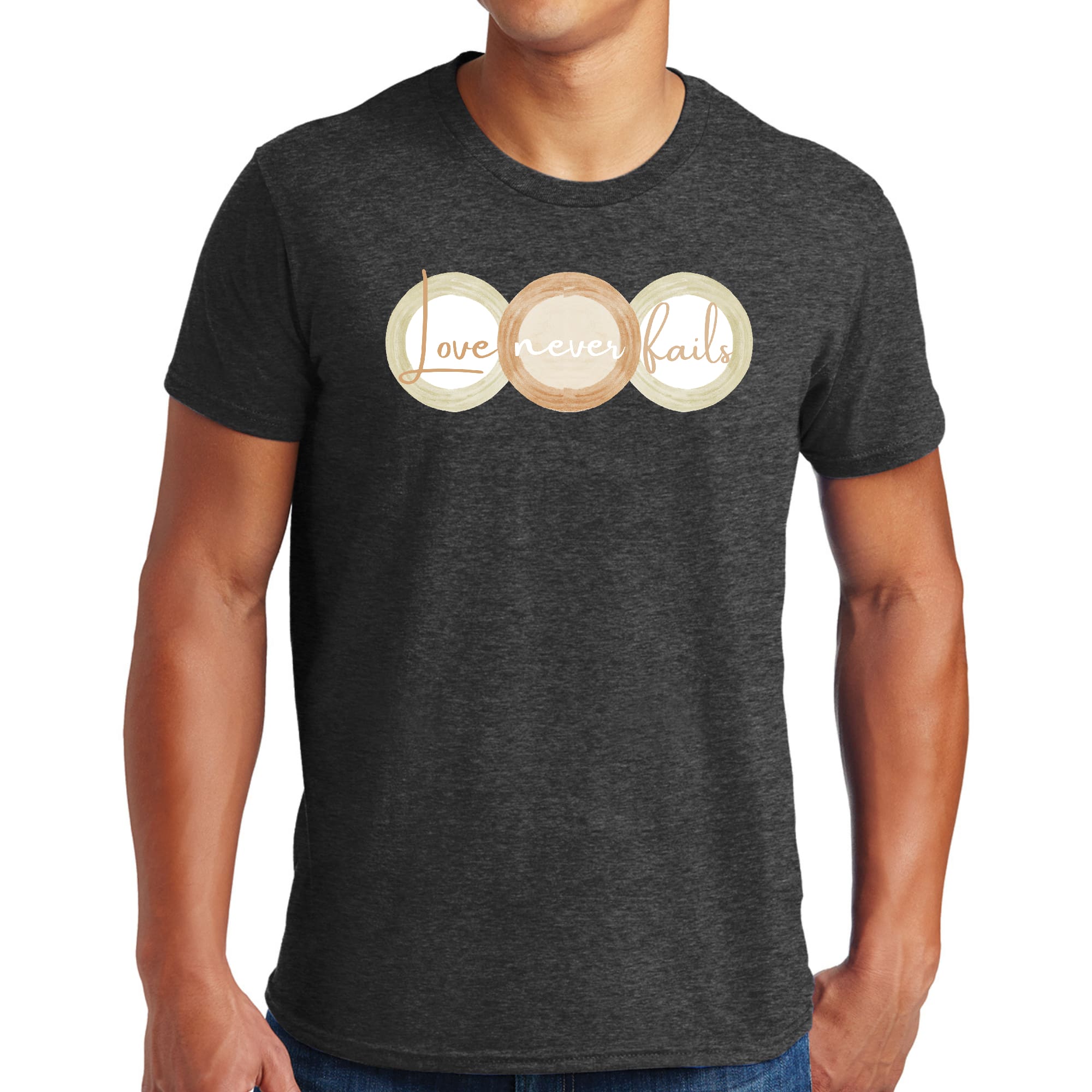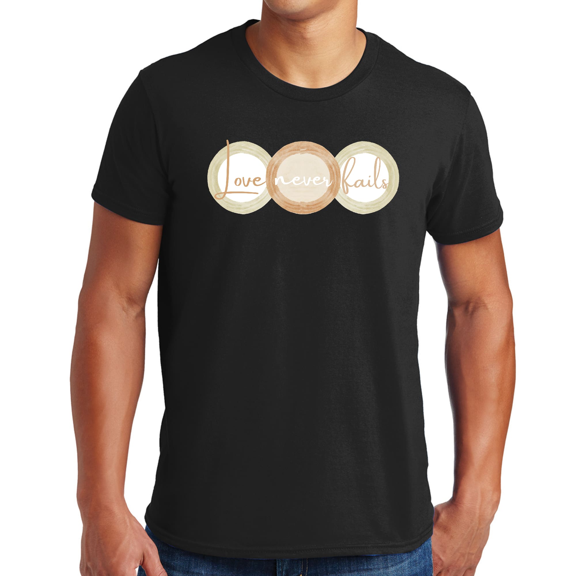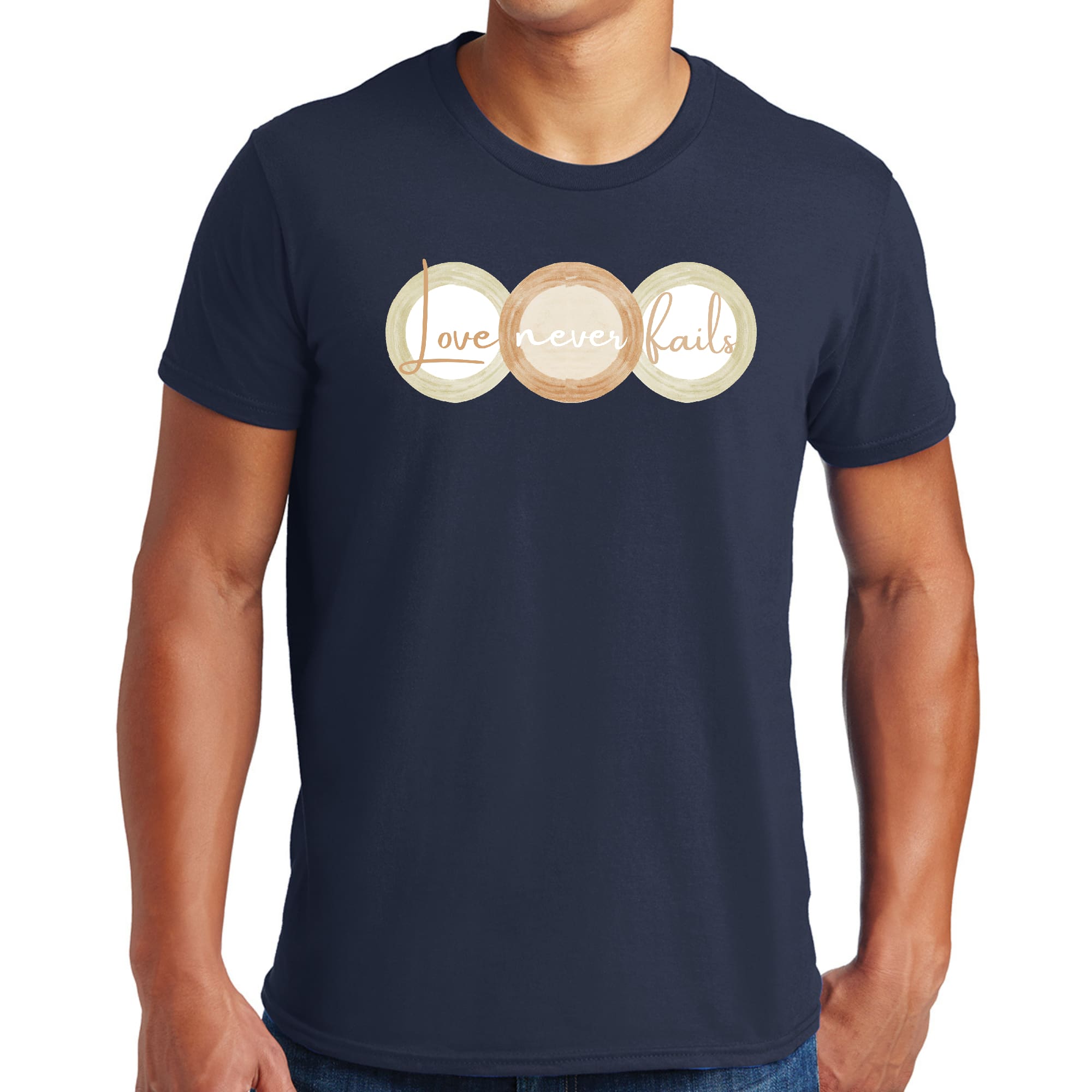 Mens Graphic T-shirt featuring 'Love Never Fails' design in pastel brown, beige, and green circular shapes, made from soft preshrunk cotton.