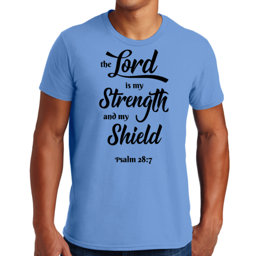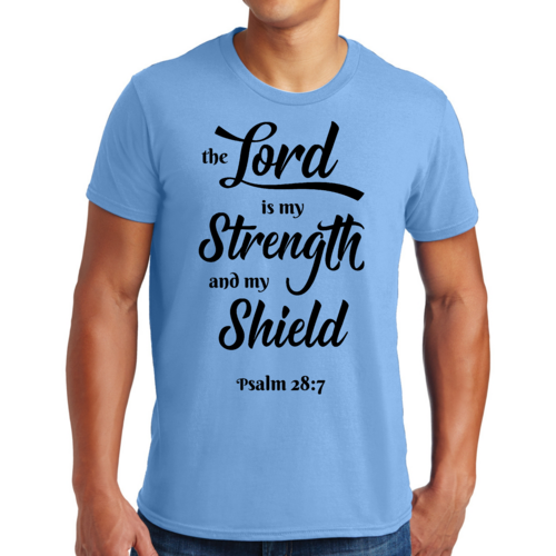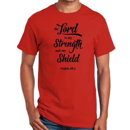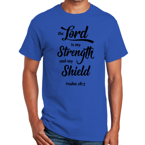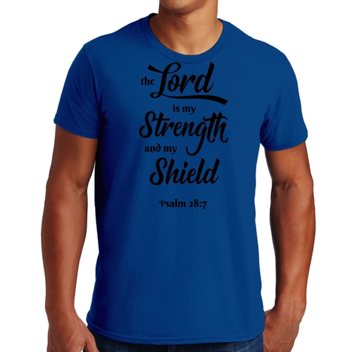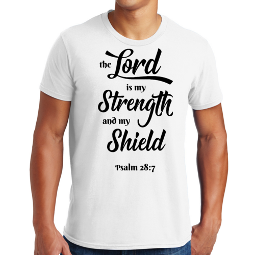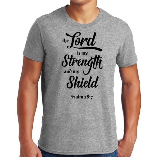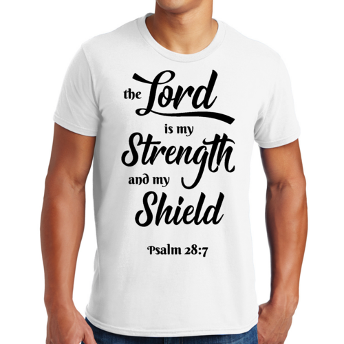 Introducing the Men's Graphic T-shirt featuring the inspiring phrase 'The Lord is my Strength and my Shield' in a striking black print. This t-shirt is designed for those who appreciate creativity and want to express their individuality through fashion. Made from high-quality cotton, it ensures comfort and breathability, making it perfect for everyday wear.