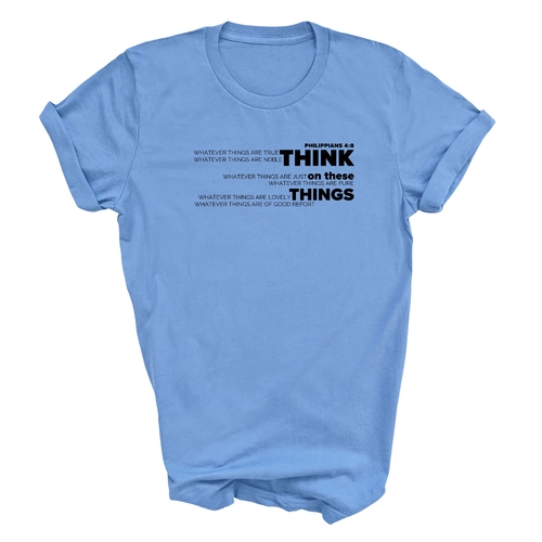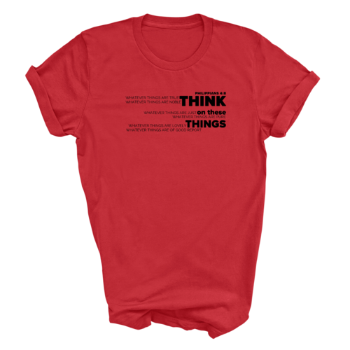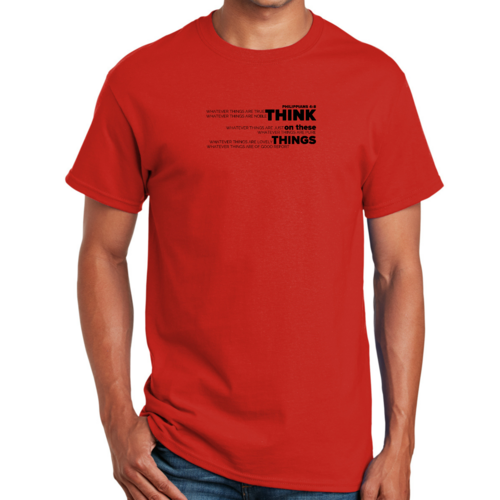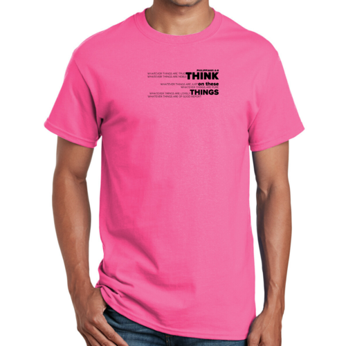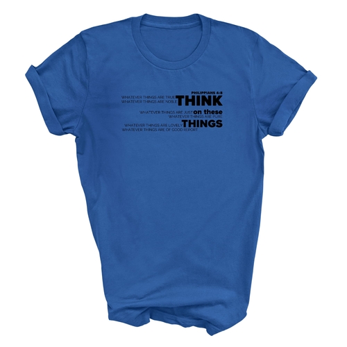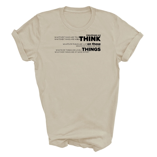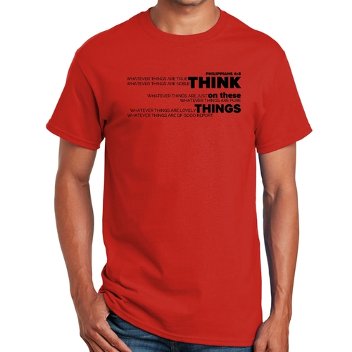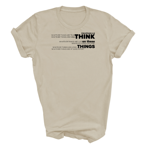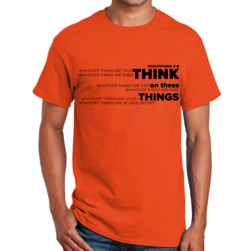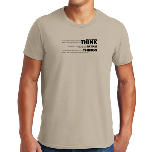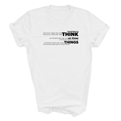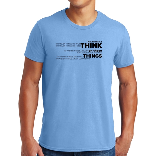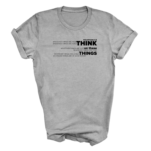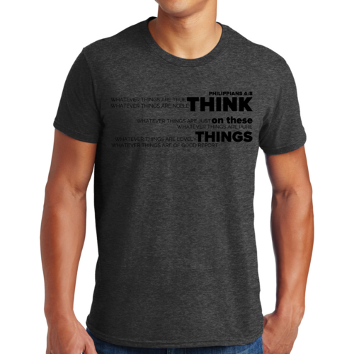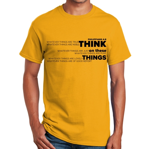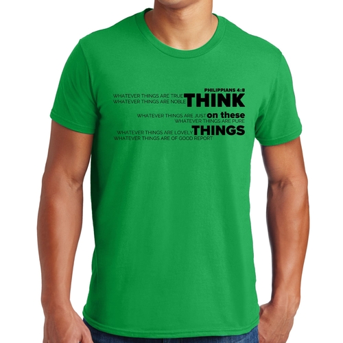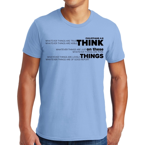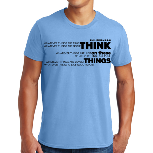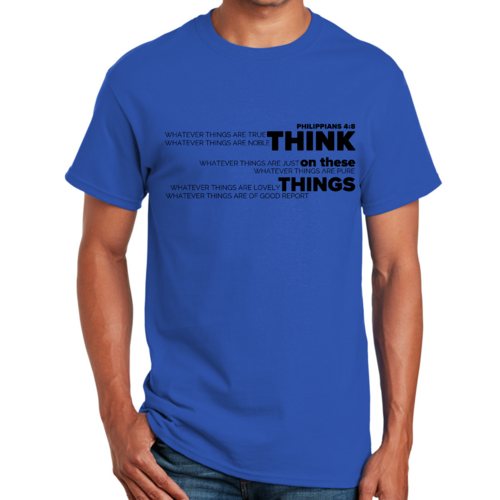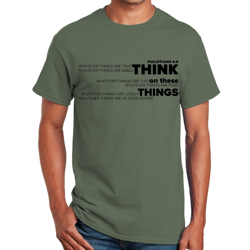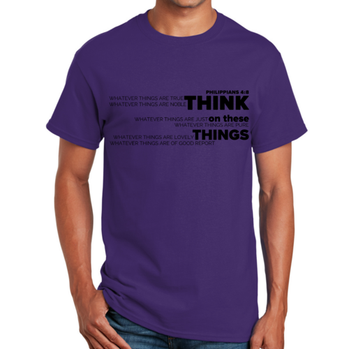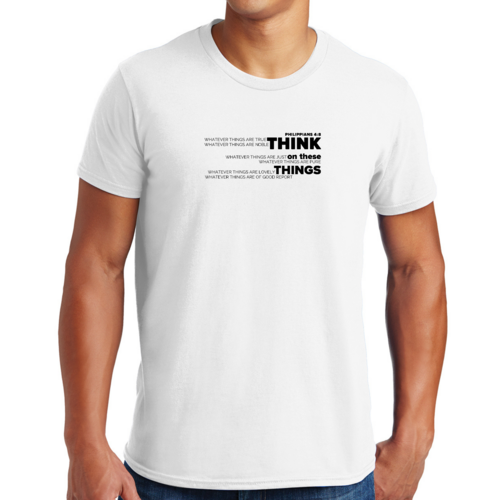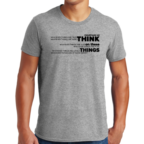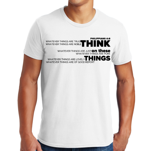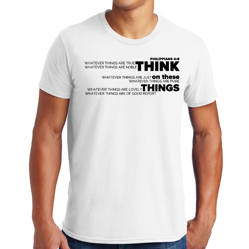 Introducing our Men's Graphic T-shirt featuring the inspiring quote 'Think on these Things' beautifully illustrated in black. This T-shirt is not just a piece of clothing; it's a statement of faith and a reminder to focus on positivity and inspiration. Made from high-quality preshrunk cotton, this shirt ensures that you enjoy both comfort and durability, making it a perfect addition to your wardrobe.