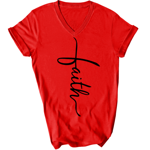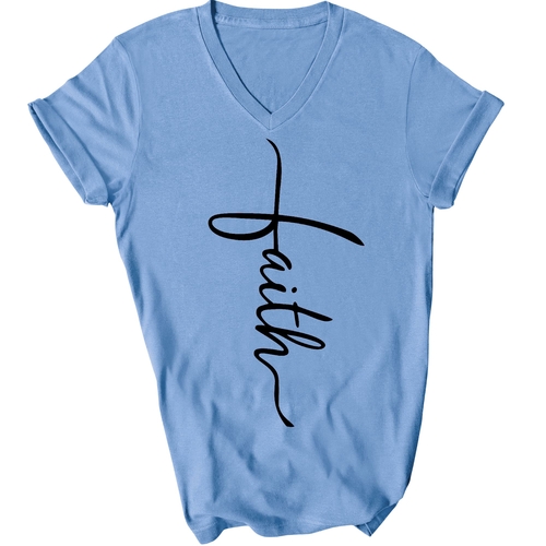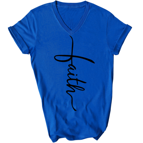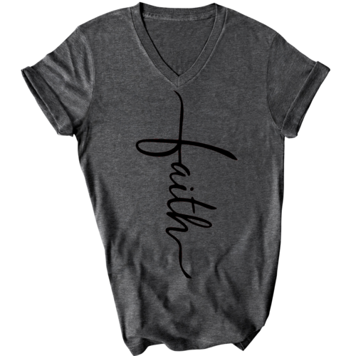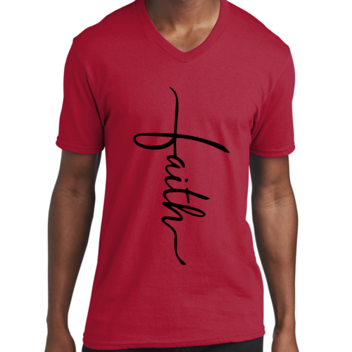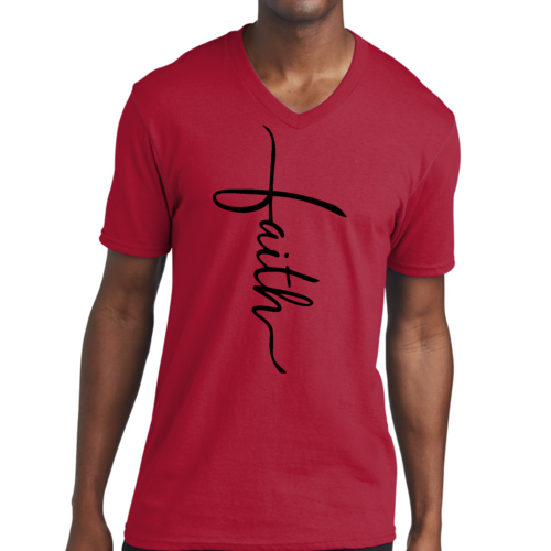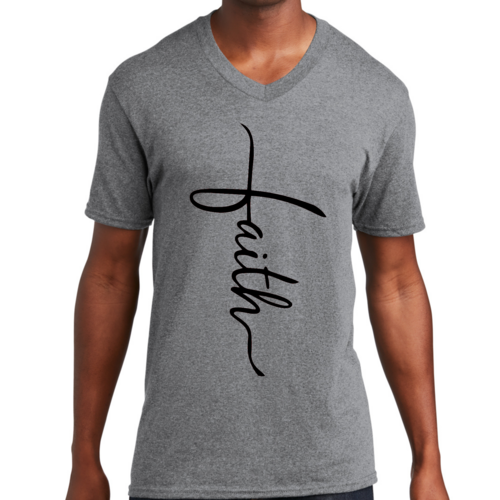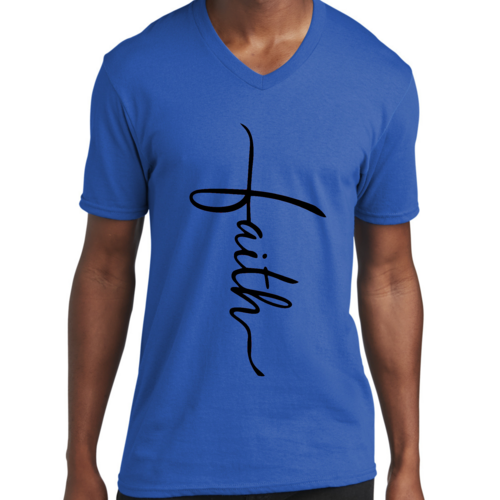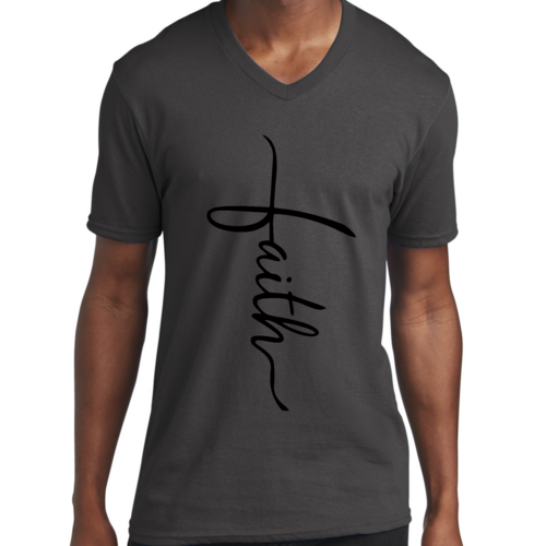 In summary, our Men's Graphic V-neck T-shirt with the Faith Script Cross black illustration is a must-have for anyone looking to combine comfort with a meaningful message. With its soft fabric, classic fit, and durable construction, this T-shirt is sure to become a favorite in your wardrobe.