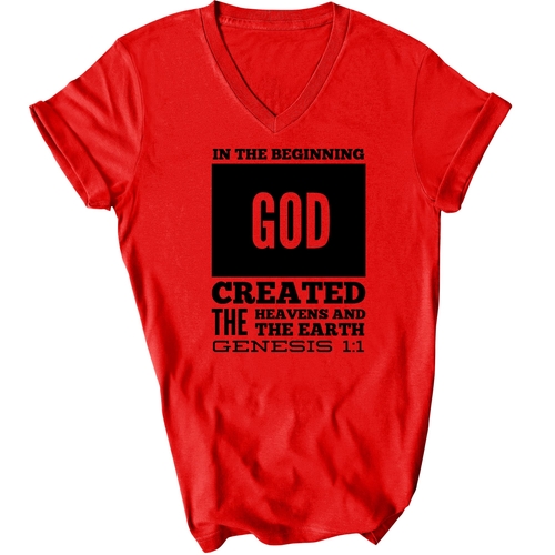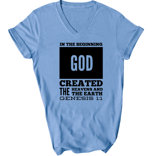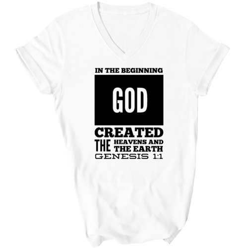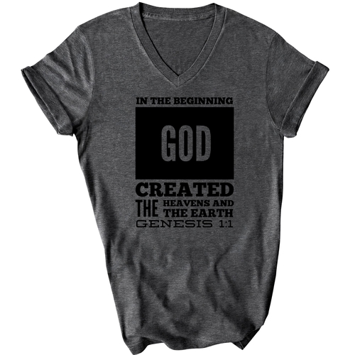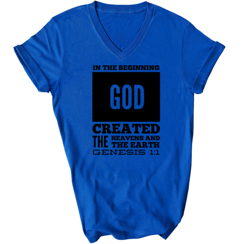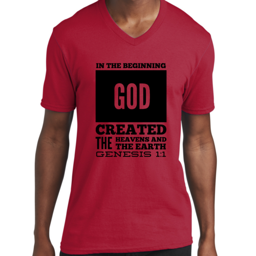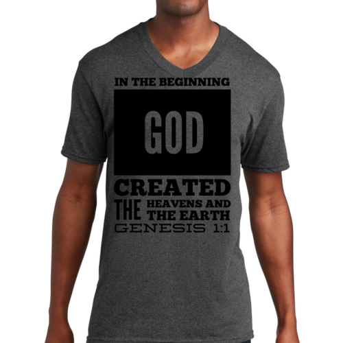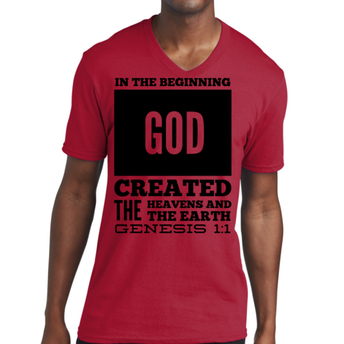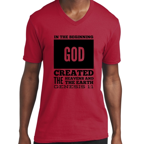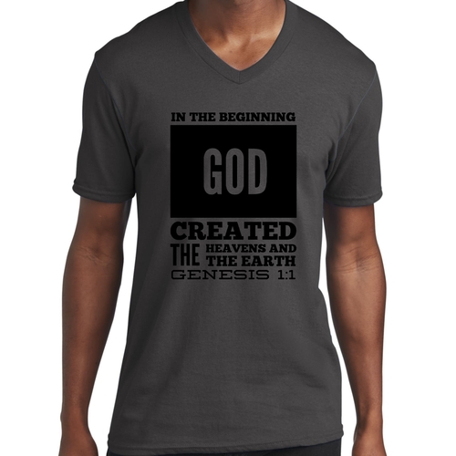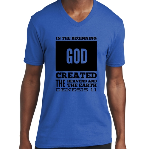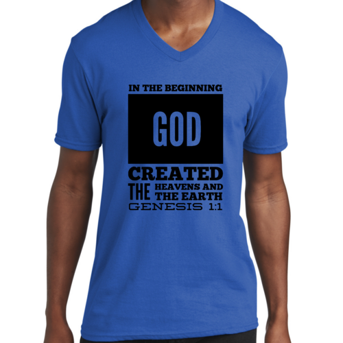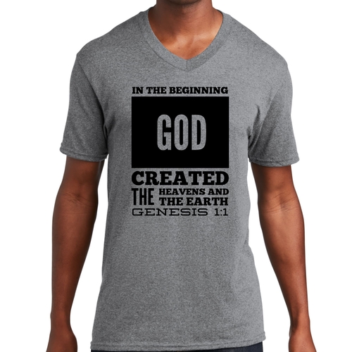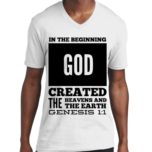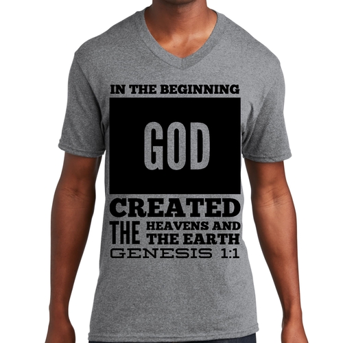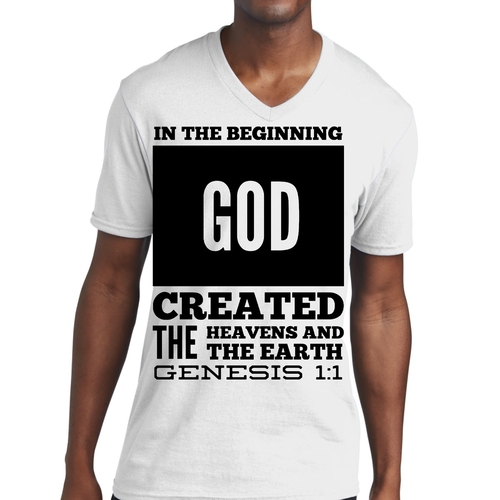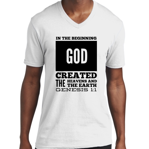 Introducing our Men's Graphic V-neck T-shirt, featuring the powerful scripture verse, 'In The Beginning God Created The Heavens And The Earth.' This stylish black T-shirt is not just a piece of clothing; it's a statement of faith and inspiration that you can wear every day. Crafted from high-quality preshrunk cotton, this T-shirt ensures that you enjoy both comfort and durability, making it a perfect addition to your wardrobe.