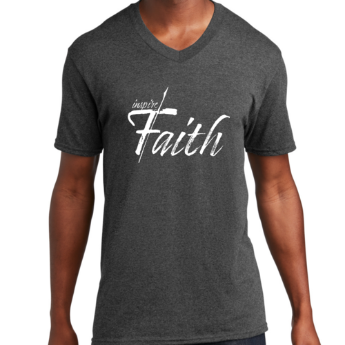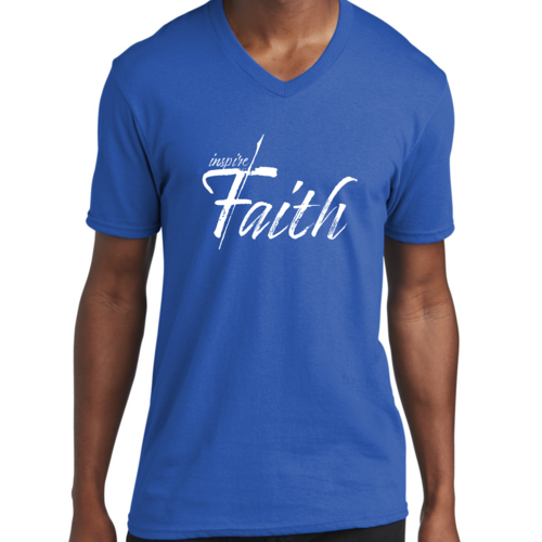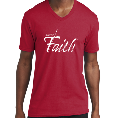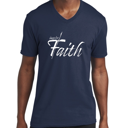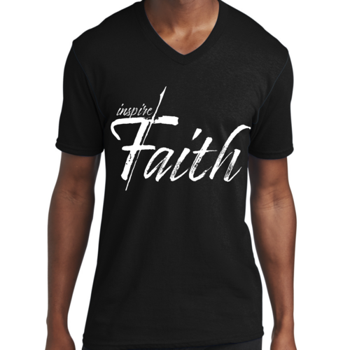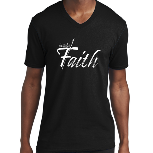 Men's Graphic V-neck T-shirt featuring Inspire Faith White Print, showcasing a unique design on soft cotton fabric.