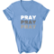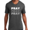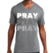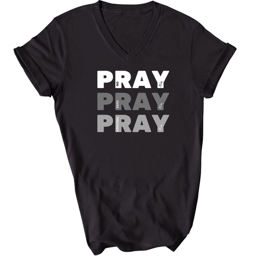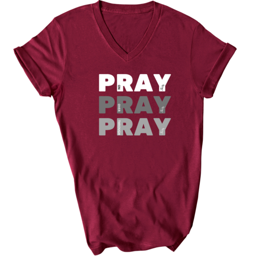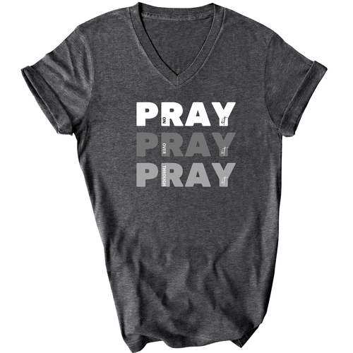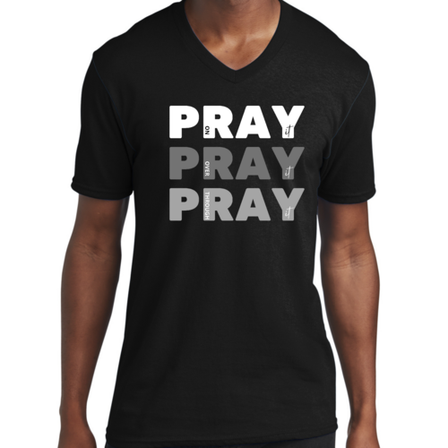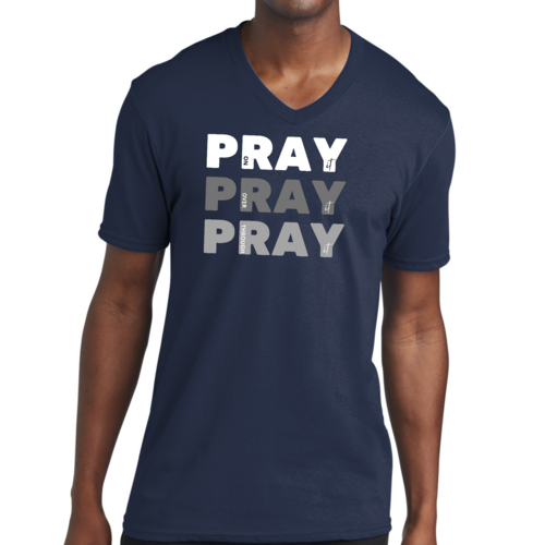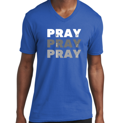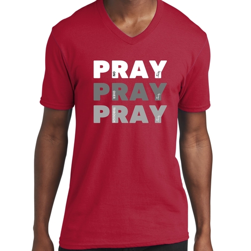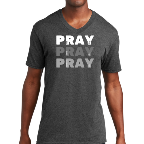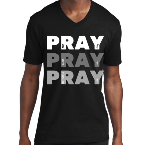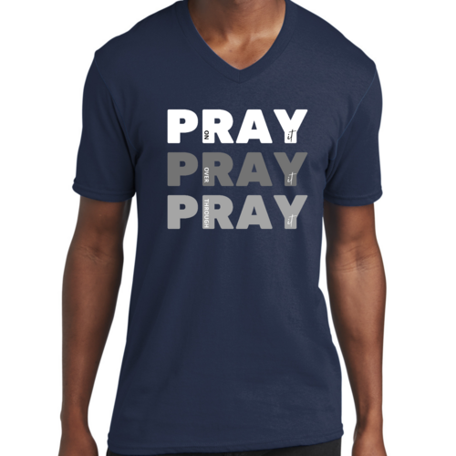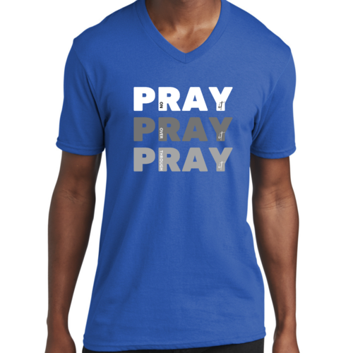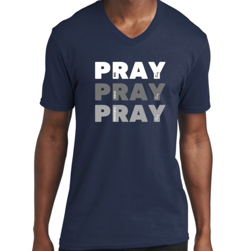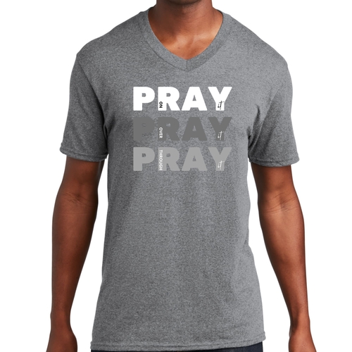 Men's Graphic V-neck T-shirt with 'Pray on it Over it Through It' printed design, showcasing soft fabric and classic fit.