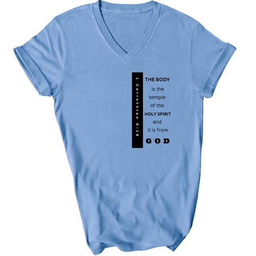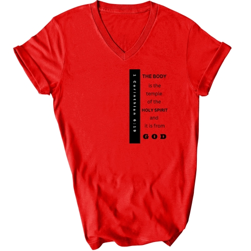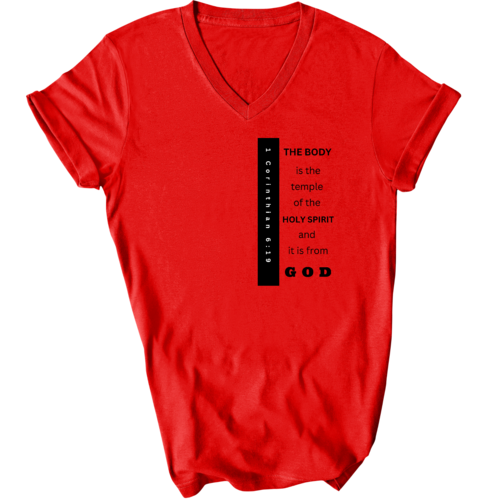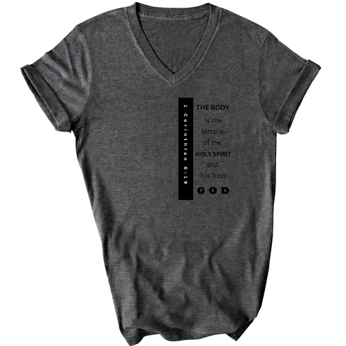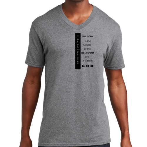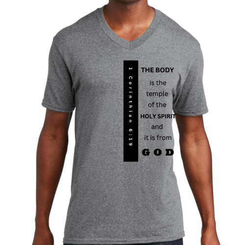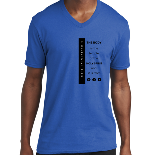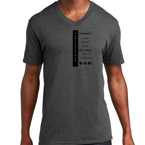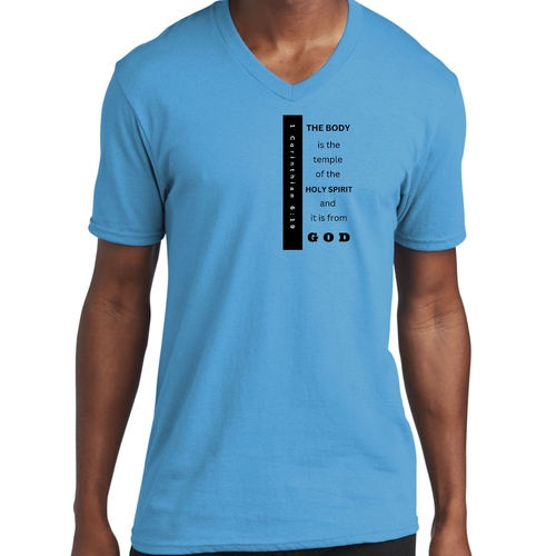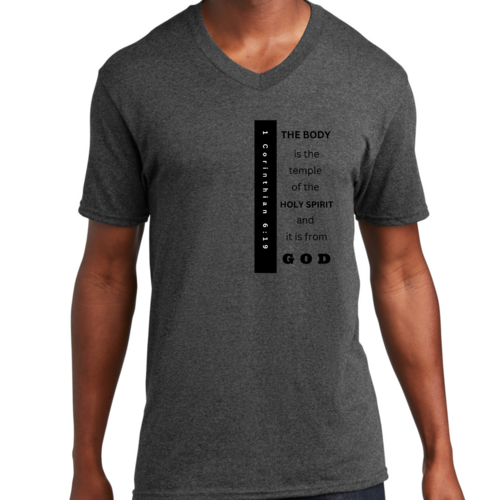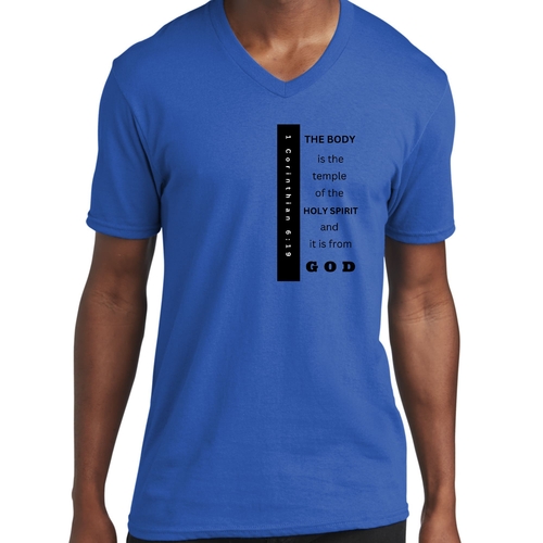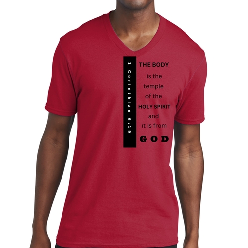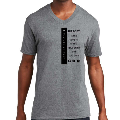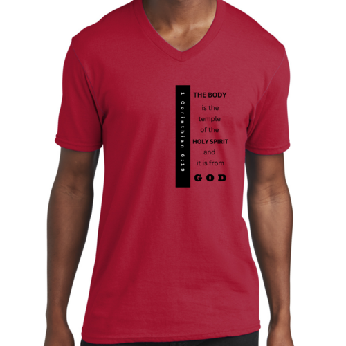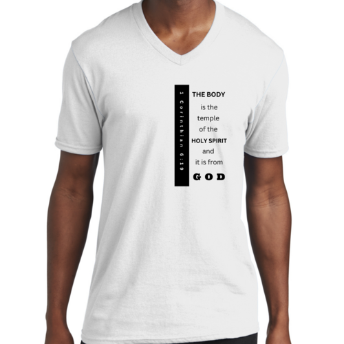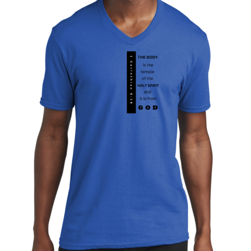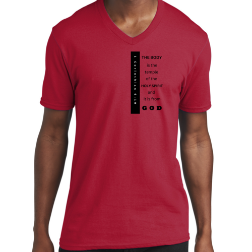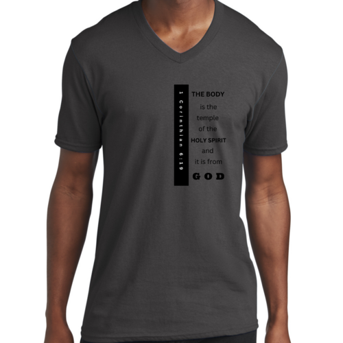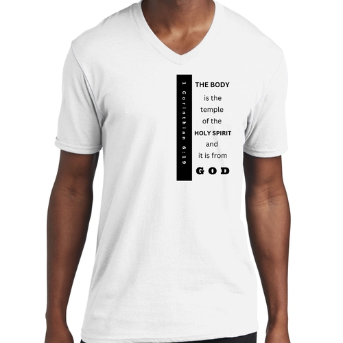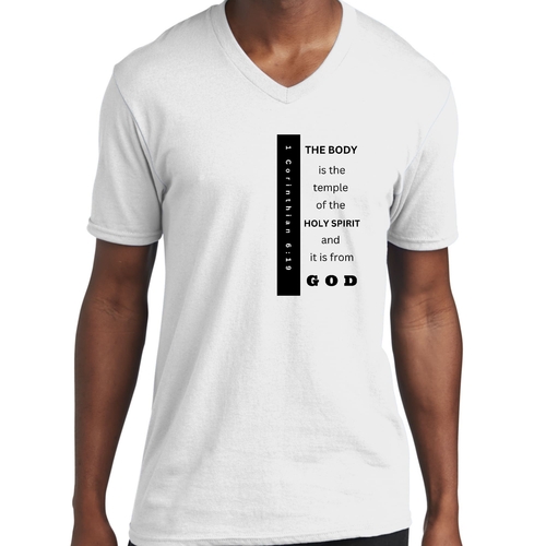 Introducing our Men's Graphic V-neck T-shirt, featuring the inspiring print 'The Body is the Temple of the Holy Spirit.' This stylish black T-shirt is not just a fashion statement; it embodies a powerful message that resonates with many. Made from soft, preshrunk cotton, this T-shirt ensures that you stay comfortable throughout the day while making a statement about your beliefs.