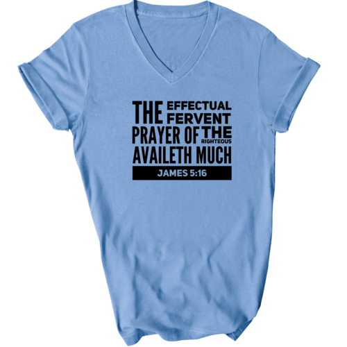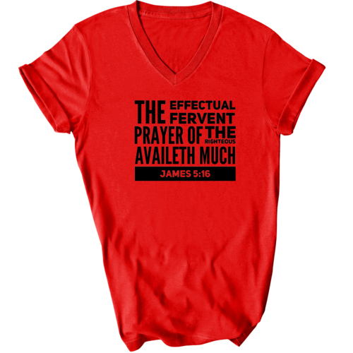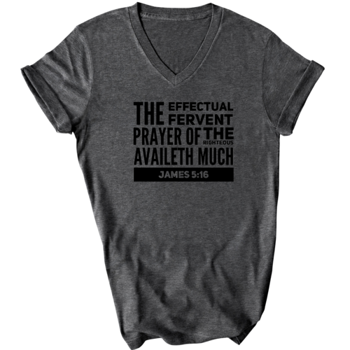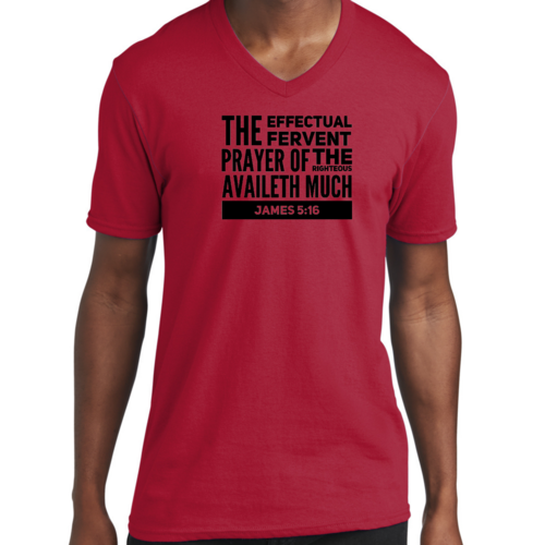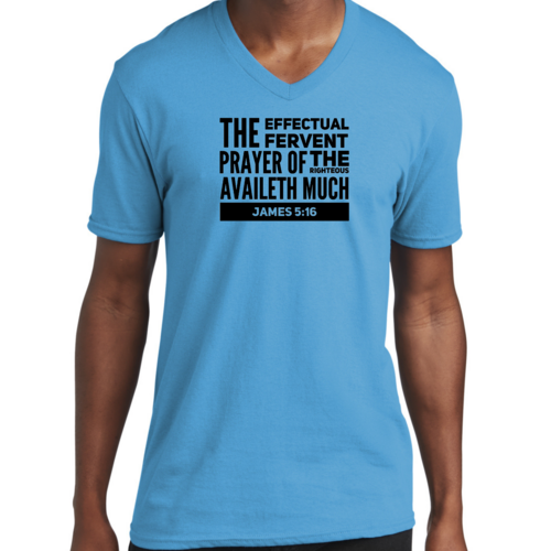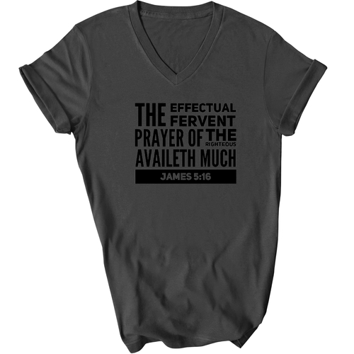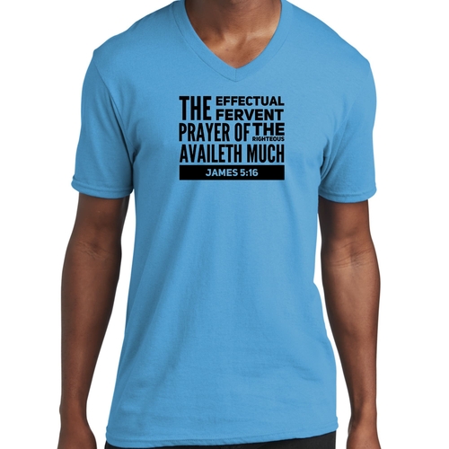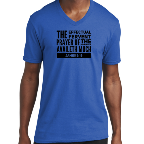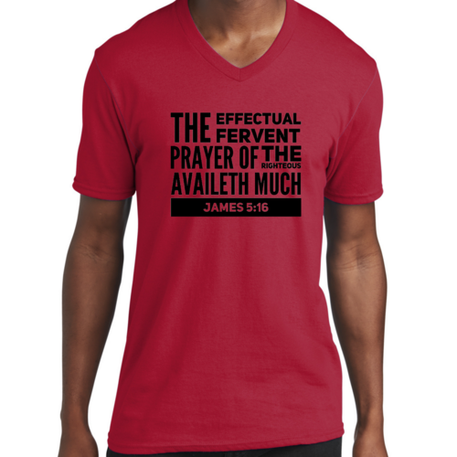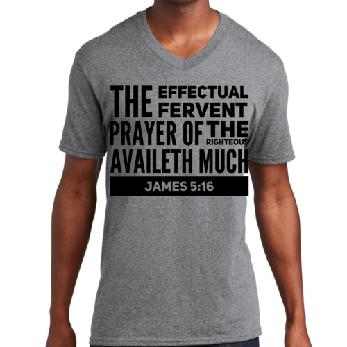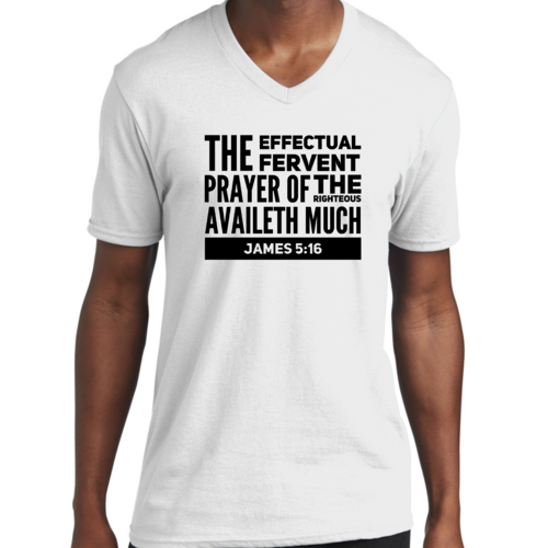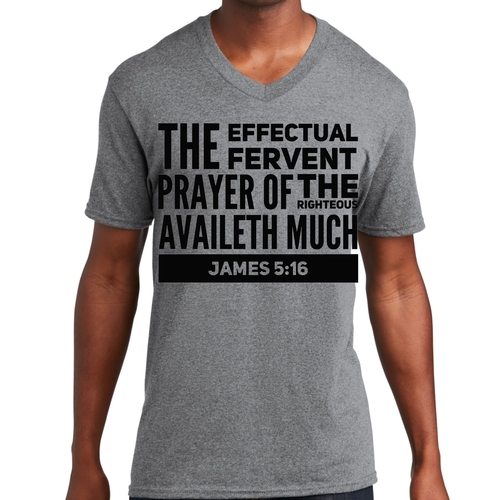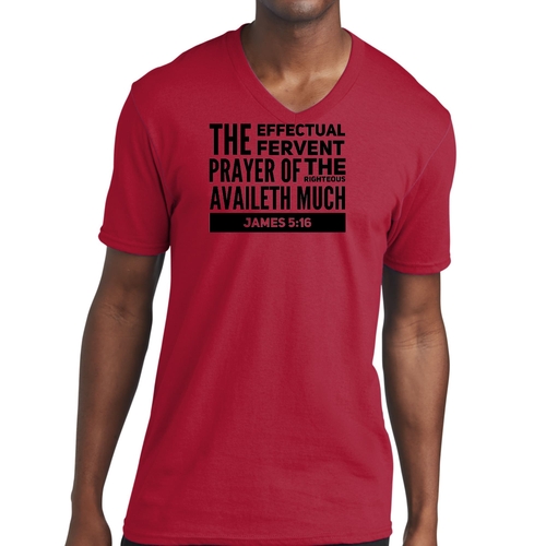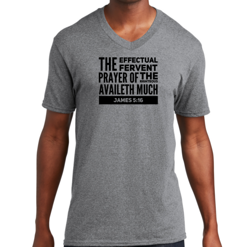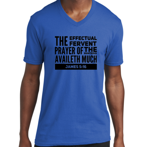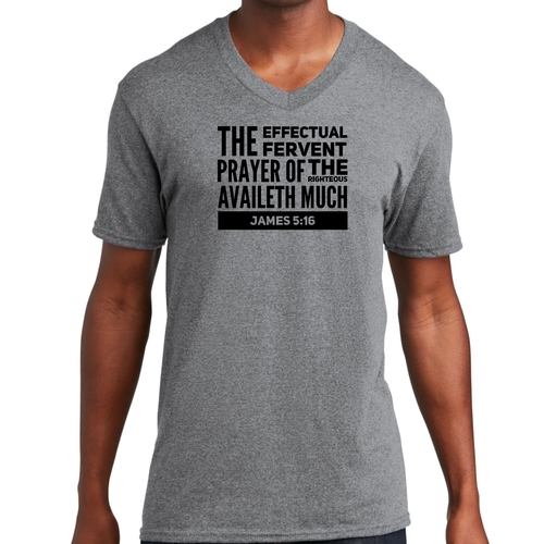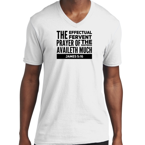 Introducing the Mens Graphic V-neck T-shirt, featuring the inspiring print of 'The Effectual Fervent Prayer Of The Righteous Availeth Much' from James 5:16. This stylish black t-shirt is not only a statement piece but also a comfortable addition to your wardrobe. Made from high-quality preshrunk cotton, this t-shirt ensures that you enjoy both softness and durability, making it perfect for everyday wear.