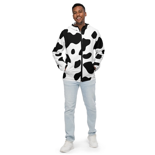 In summary, the Men's Hooded Windbreaker Jacket in black and white cow print is a must-have for anyone looking to combine style with practicality. With its lightweight, water-resistant fabric, breathable mesh lining, and versatile design, this jacket is perfect for any occasion. Don't miss out on the chance to elevate your outerwear collection with this trendy piece!