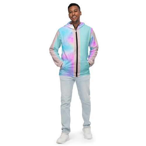 Don't miss out on the opportunity to enhance your wardrobe with this stylish and functional windbreaker. Order your Men's Hooded Windbreaker Jacket in pastel colorblock watercolor today and experience the perfect blend of comfort and style!