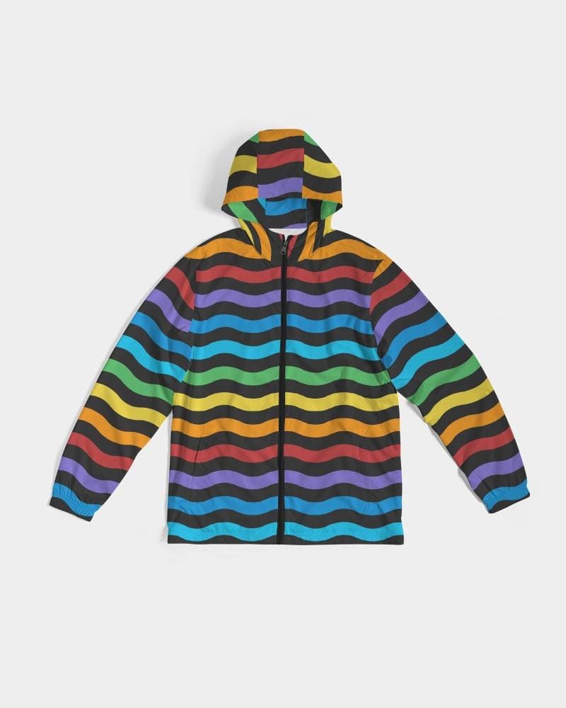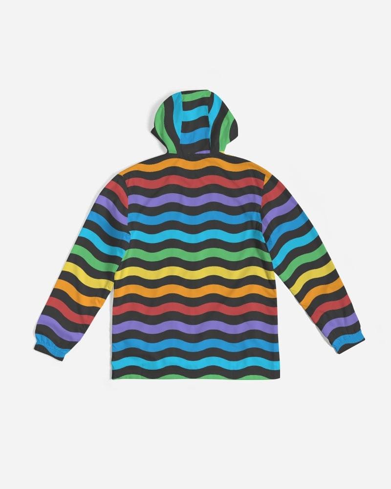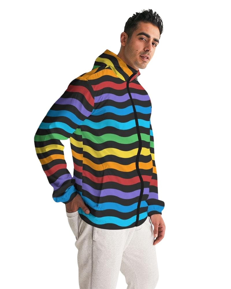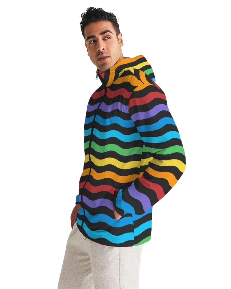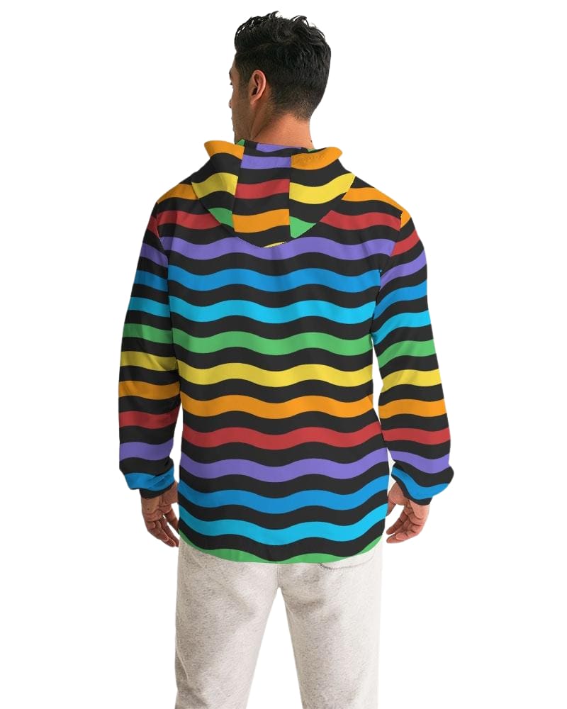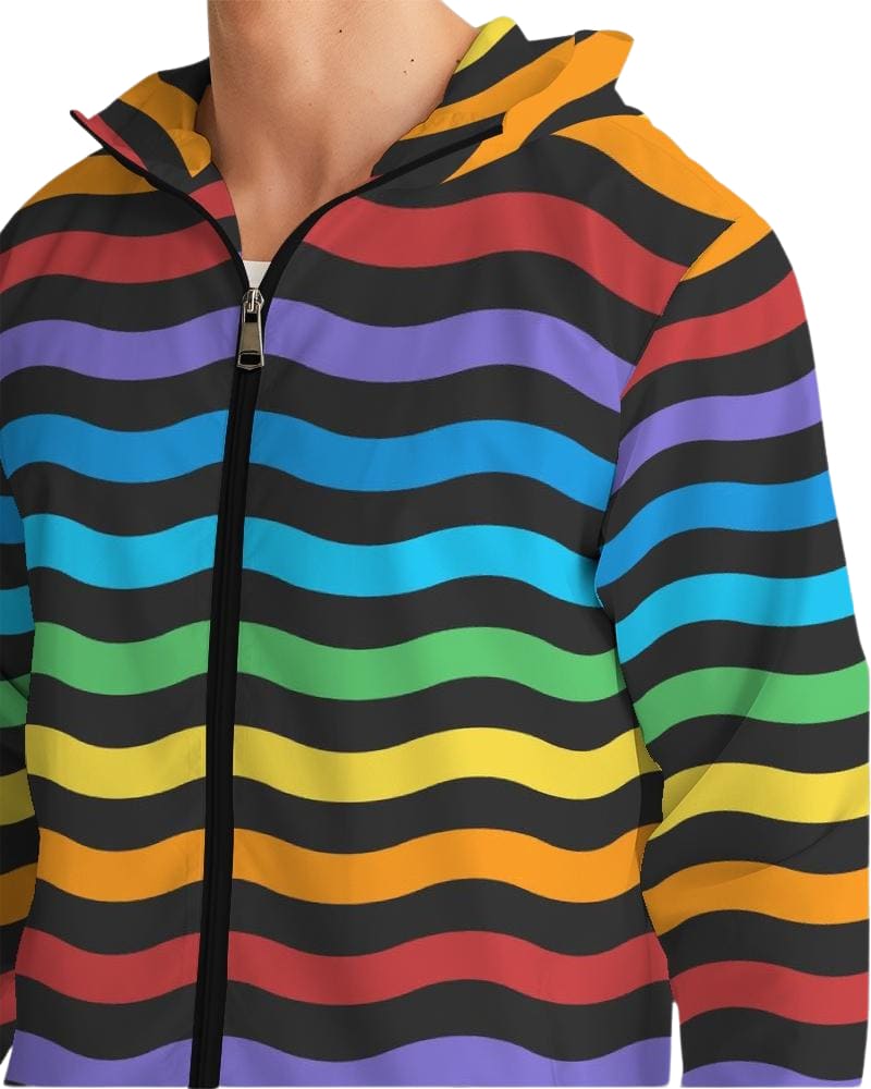 Men's Hooded Windbreaker featuring rainbow stripes, water-resistant fabric, and elastic cuffs, perfect for windy and rainy weather.