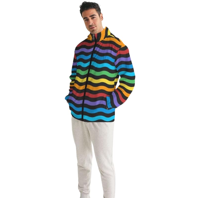 Introducing the Men's Hooded Windbreaker, a perfect blend of style and functionality designed to keep you comfortable during windy and rainy days. This jacket features a vibrant rainbow striped design that not only makes a fashion statement but also ensures you stand out in any crowd. Made from lightweight, water-resistant fabric, this windbreaker is ideal for outdoor activities, casual outings, or simply running errands.