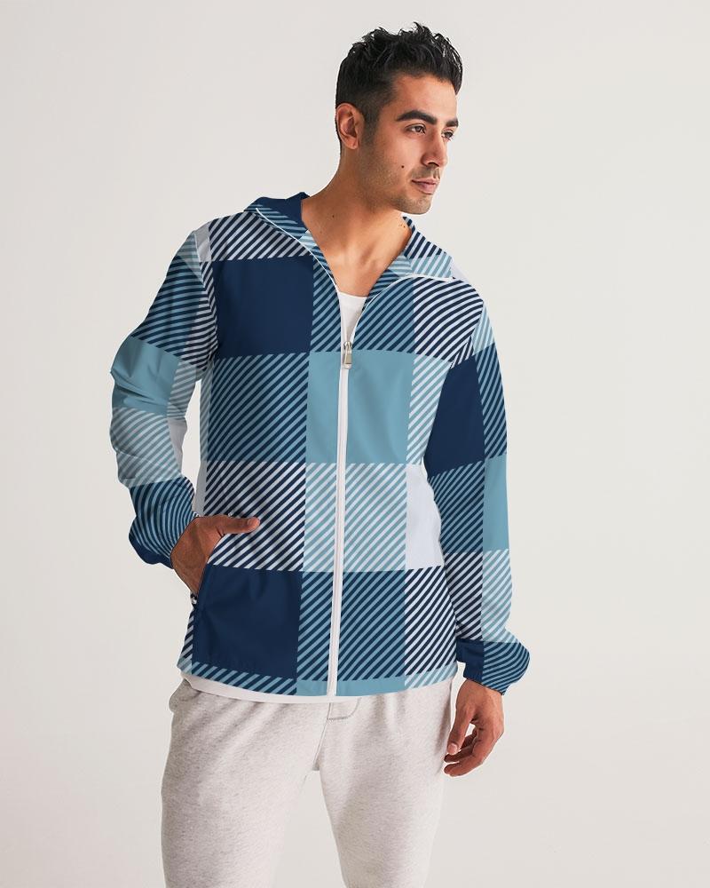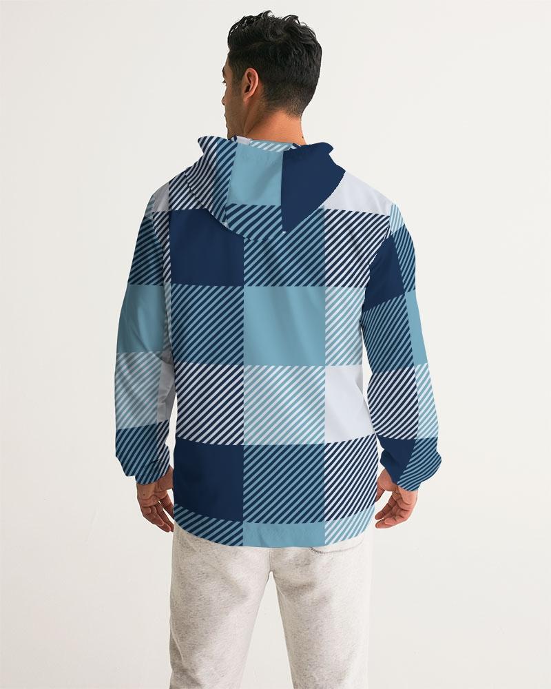 Men's Hooded Windbreaker in Tartan Plaid Blue, showcasing its stylish design and water-resistant fabric.