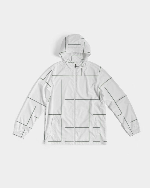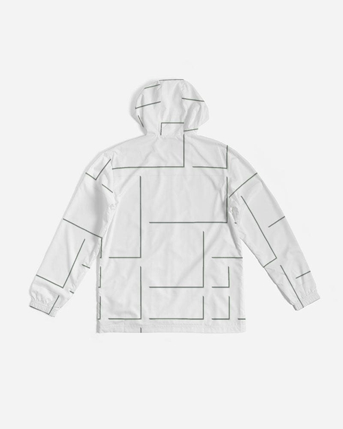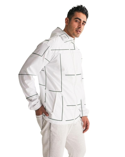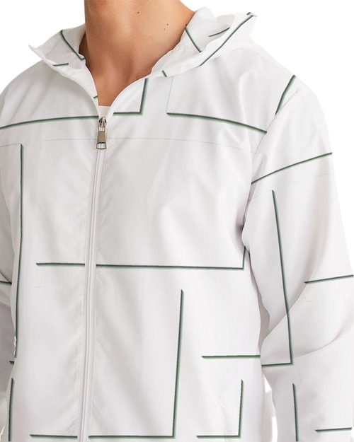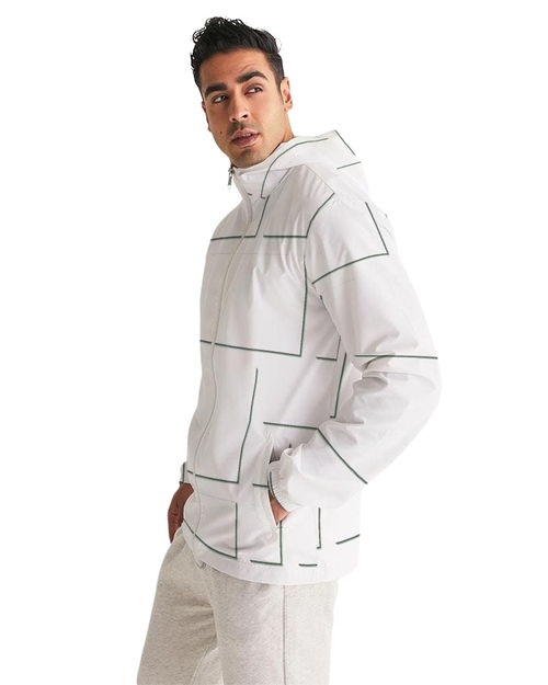 Mens Hooded Windbreaker - White Grid Pattern Water Resistant Jacket