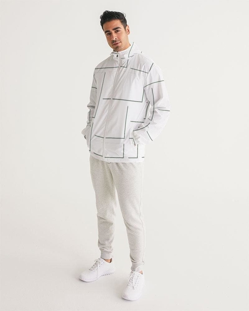 Introducing the Men's Hooded Windbreaker, a must-have for anyone looking to stay stylish while braving the elements. This jacket features a striking white grid pattern that not only looks great but also provides essential protection against wind and rain. Made from lightweight, water-resistant fabric, this windbreaker is perfect for those unpredictable weather days.