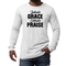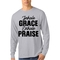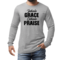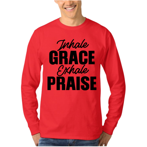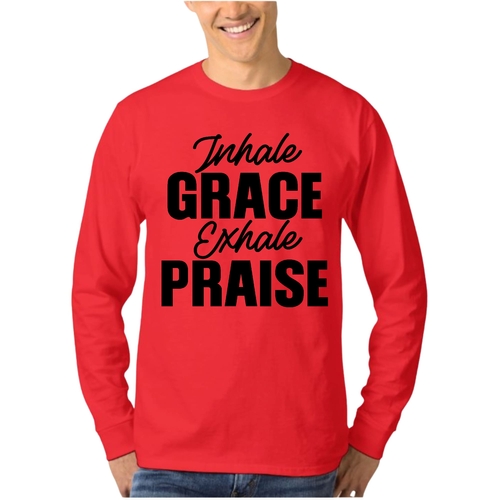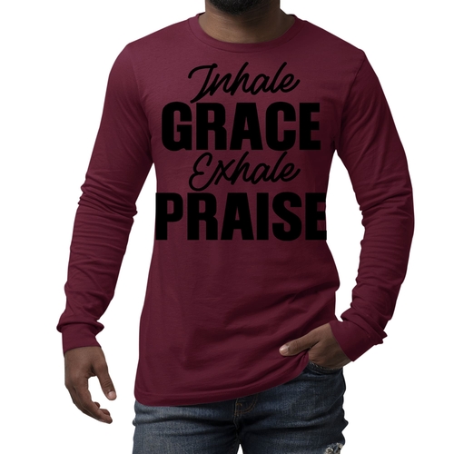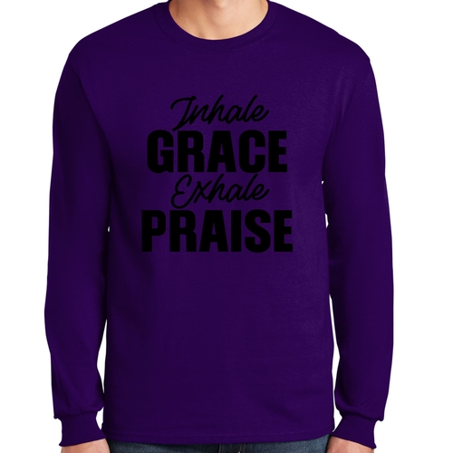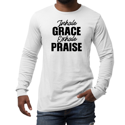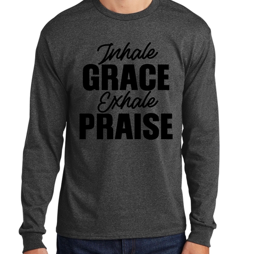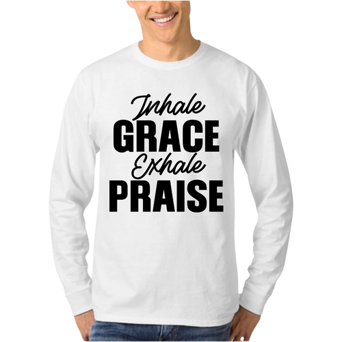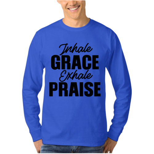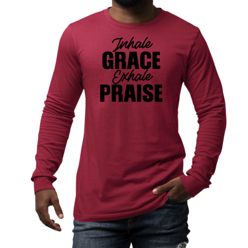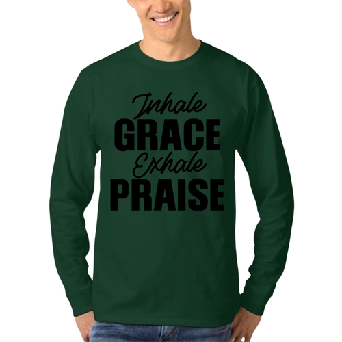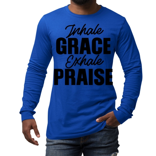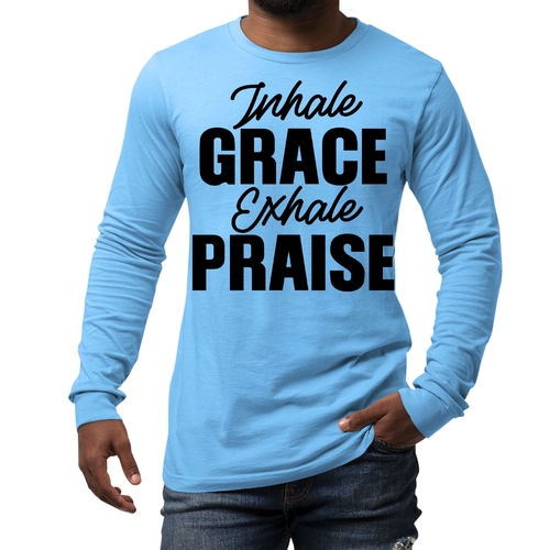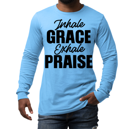 Introducing the Men's Long Sleeve Graphic T-shirt featuring the inspiring phrase 'Inhale Grace Exhale Praise'. This stylish and comfortable tee is perfect for anyone looking to express their values through fashion. Made from high-quality cotton, this shirt offers a soft touch against the skin, making it ideal for all-day wear. Whether you're lounging at home, heading out with friends, or attending a casual event, this graphic tee is a versatile addition to your wardrobe.