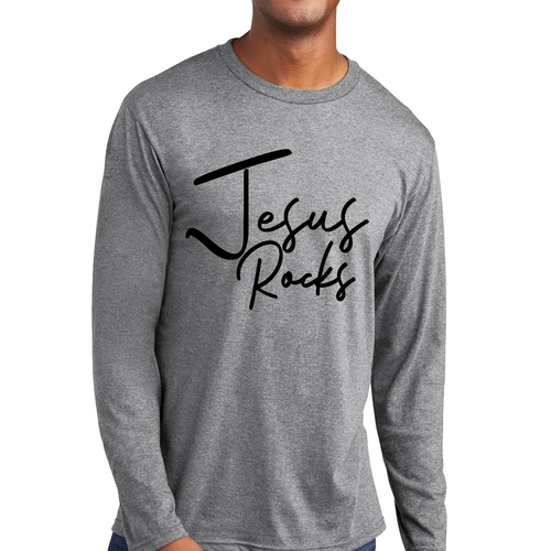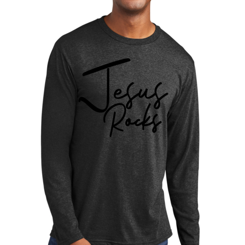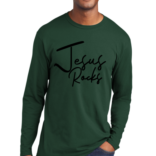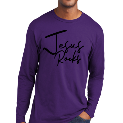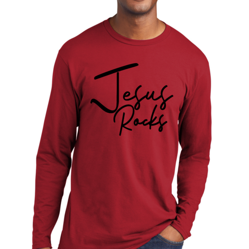 Introducing our Men's Long Sleeve Graphic T-shirt featuring the uplifting 'Jesus Rocks' print, designed for those who want to express their faith with style and comfort. This t-shirt is not just a piece of clothing; it's a statement of belief and inspiration. Made from high-quality preshrunk cotton, this tee ensures that you stay comfortable throughout the day while retaining its shape and softness even after multiple washes.