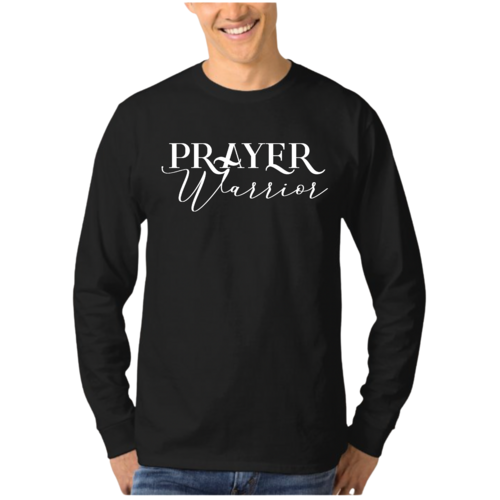 In summary, our Men's Long Sleeve Graphic T-shirt featuring the Prayer Warrior script style is a must-have for anyone looking to express their faith through fashion. With its soft fabric, durable construction, and inspirational design, this T-shirt is sure to become a favorite in your collection.