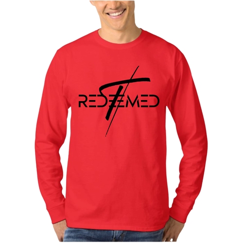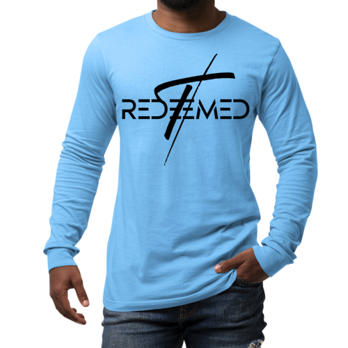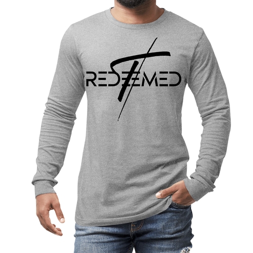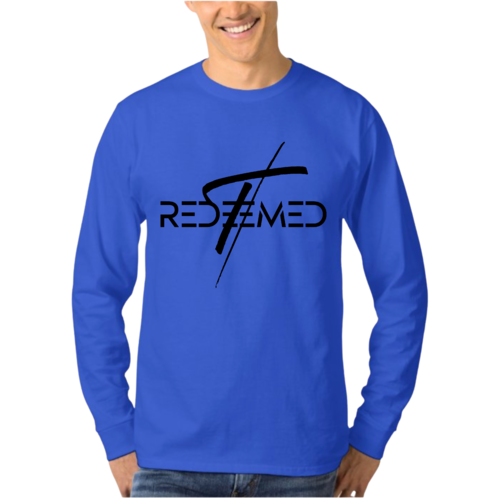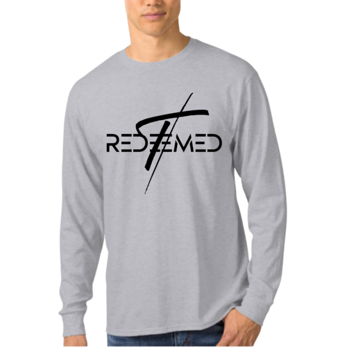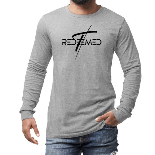 Men's Long Sleeve Graphic T-shirt featuring a black Redeemed Cross illustration, made from soft preshrunk cotton.