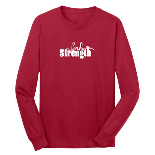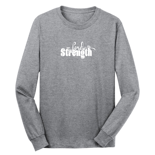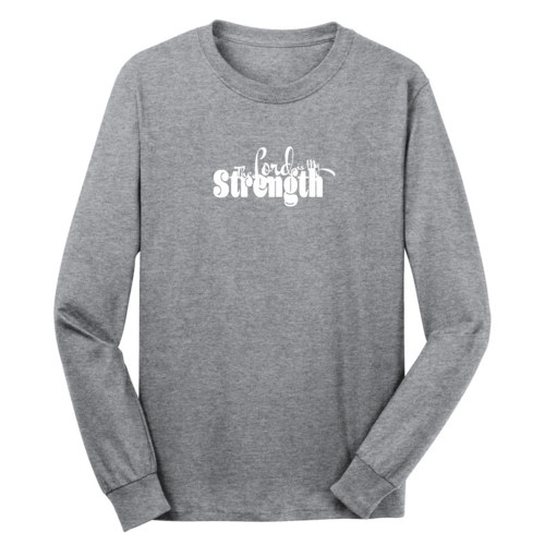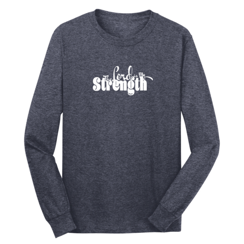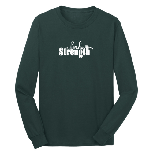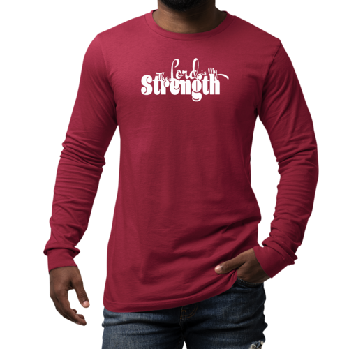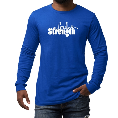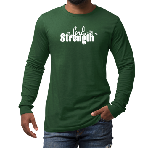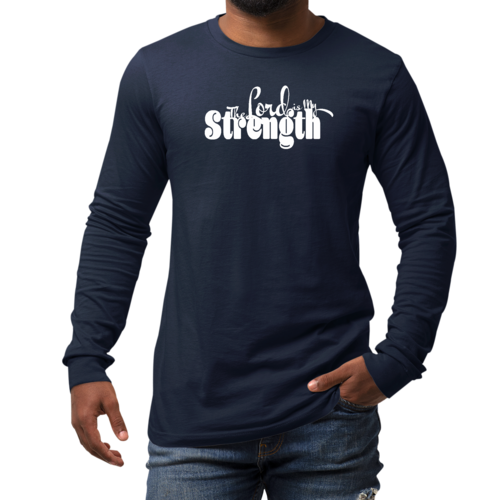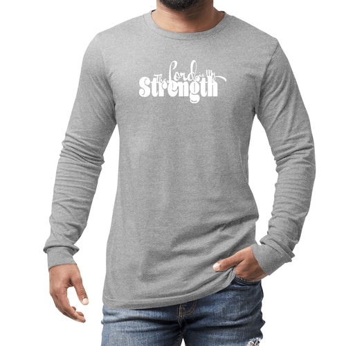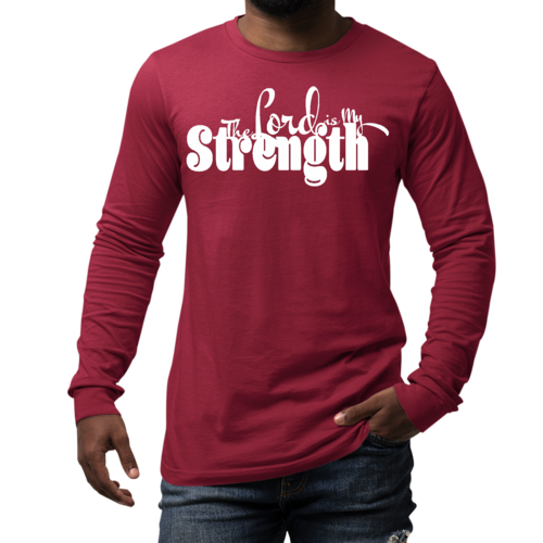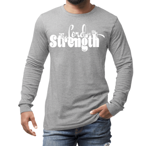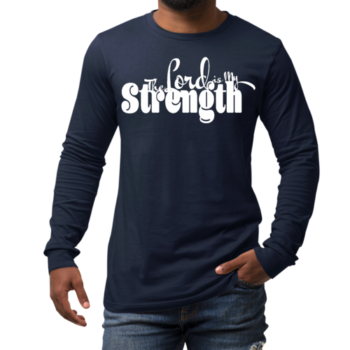 Men's long sleeve graphic t-shirt featuring 'The Lord is my Strength' print, made from soft preshrunk cotton with a classic fit.