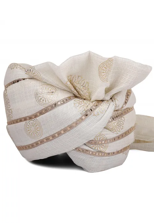 The printed Kota Dorian woven turban/pagri for men combines traditional Kota weaving with printed designs, creating a lightweight, breathable option for everyday wear or cultural events.