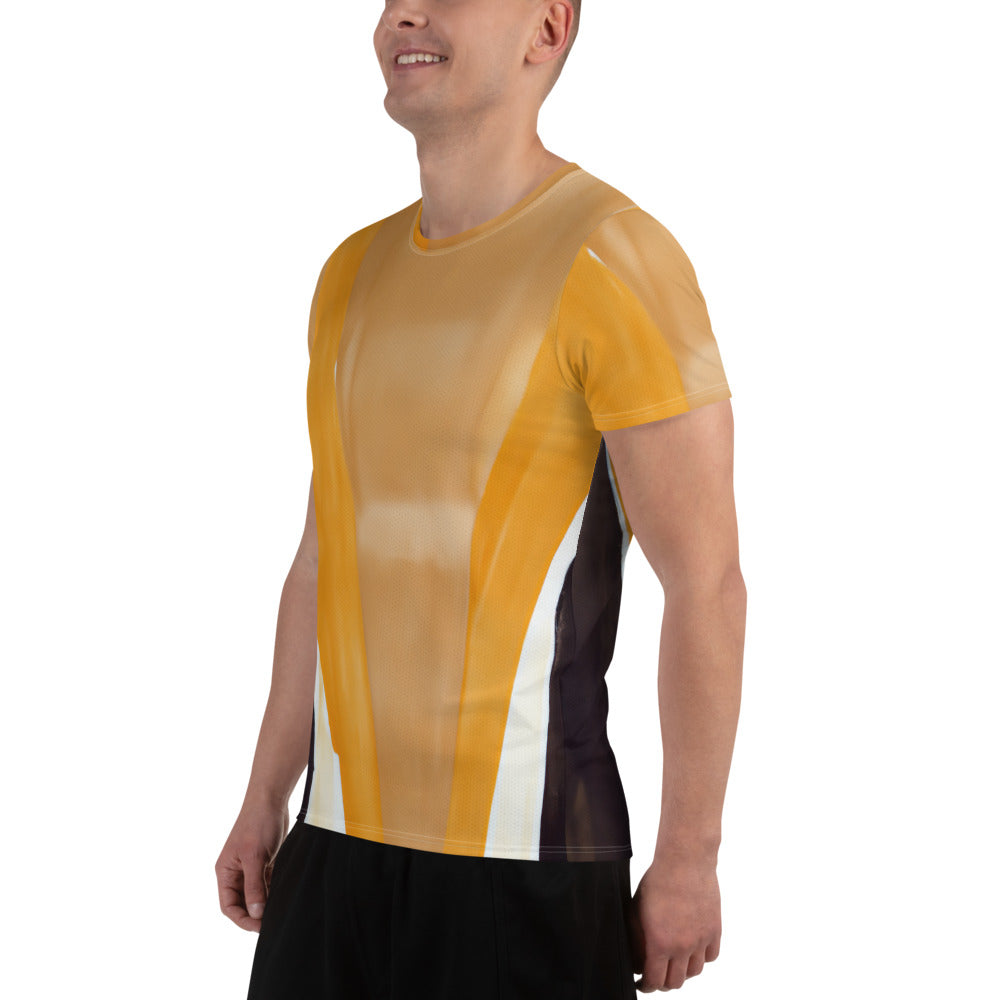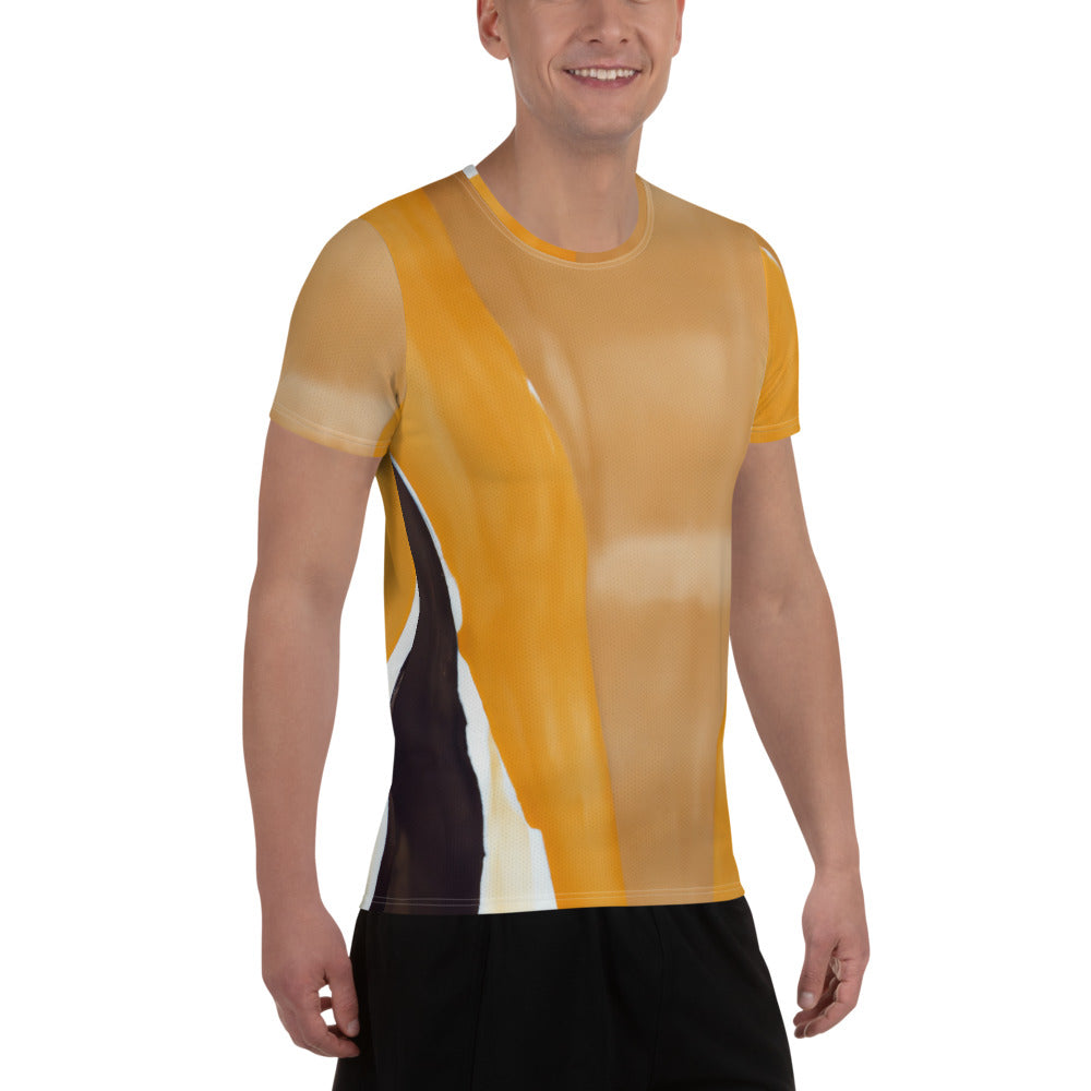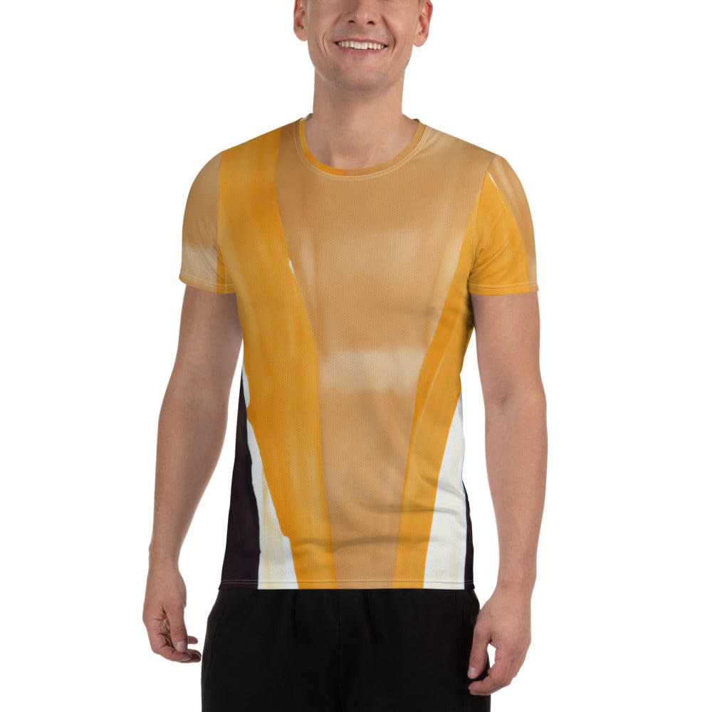 Introducing our Men's Stretch Fit Athletic Sports T-shirt in a striking yellow brown abstract pattern, designed to enhance your workout experience. This t-shirt is not just about style; it combines functionality with comfort, making it an essential addition to your athletic wardrobe. Crafted from a premium blend of 92% polyester and 8% spandex, this t-shirt offers a snug yet flexible fit that adapts to your movements, ensuring you can perform at your best.