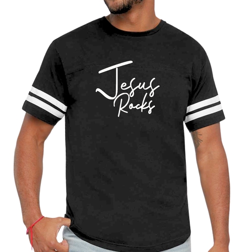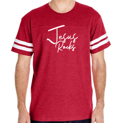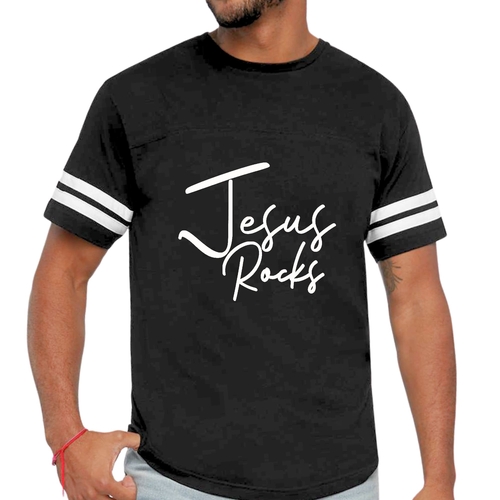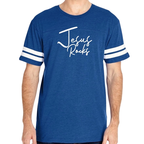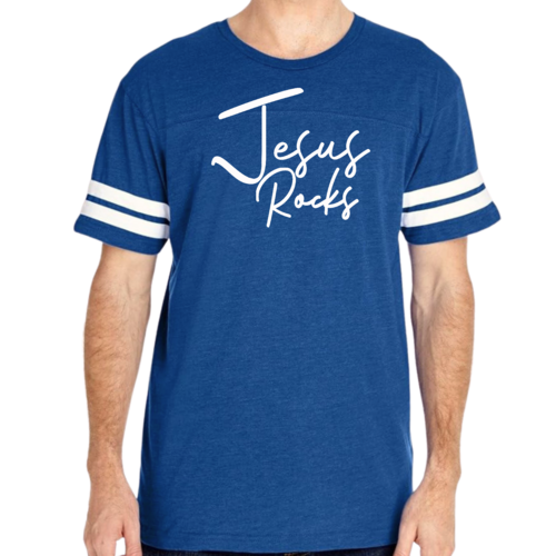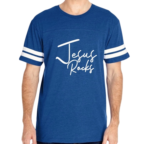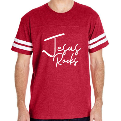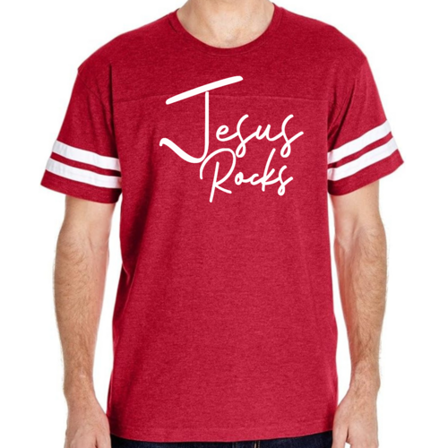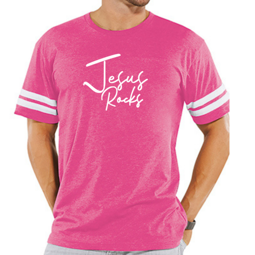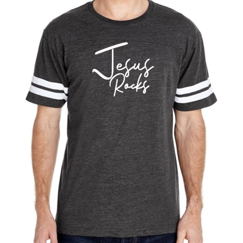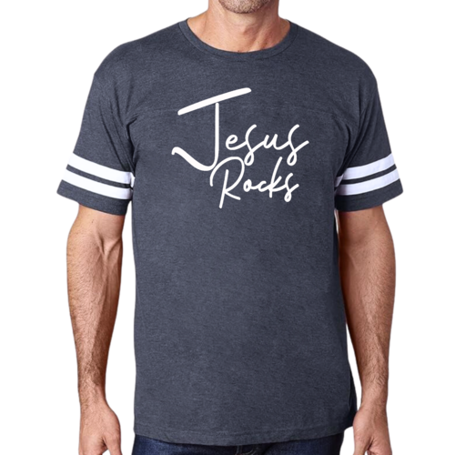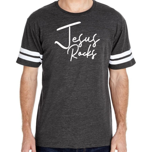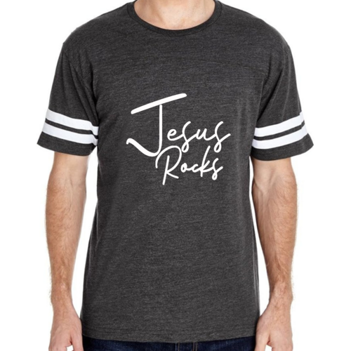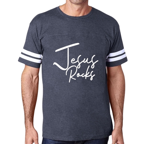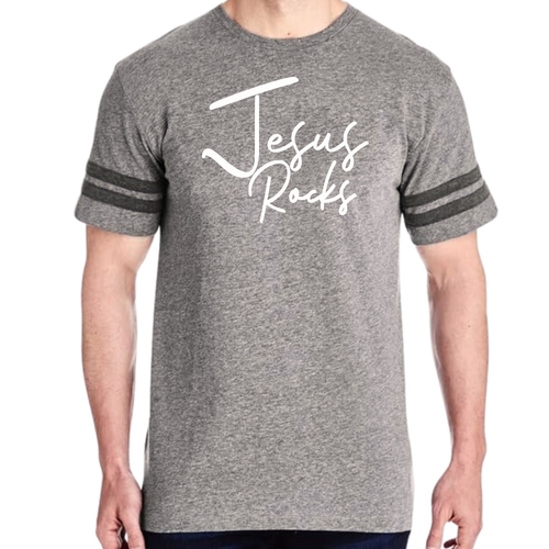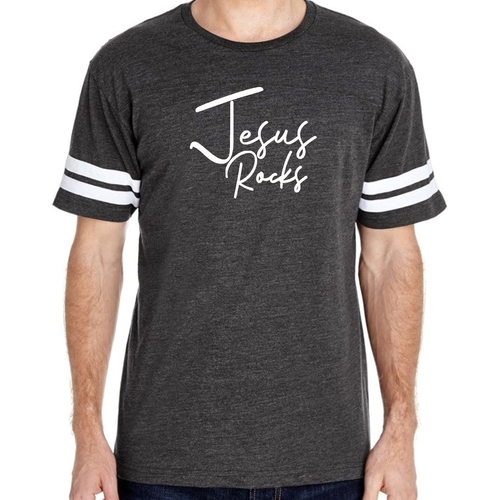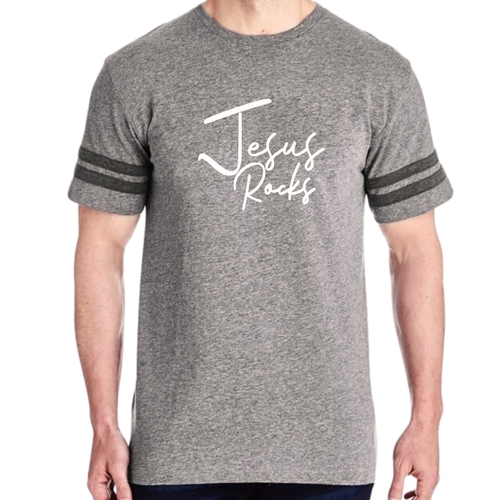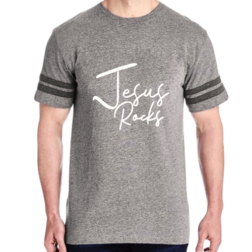 The vintage-inspired design of this t-shirt is sure to turn heads. The 'Jesus Rocks' graphic is not only eye-catching but also serves as a reminder of your faith. The two contrast stripes on the sleeves add a sporty touch, making it a versatile piece that can be paired with shorts, joggers, or jeans.