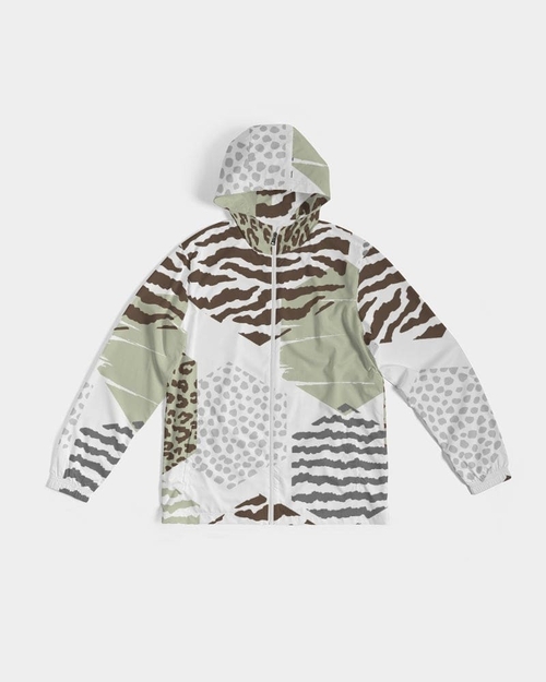 The brown and green geometric design adds a modern touch to this classic windbreaker. The unique print is cut and handmade, ensuring that each piece is one-of-a-kind. This jacket is not just a functional piece of clothing; it’s a fashion statement that reflects your personal style.