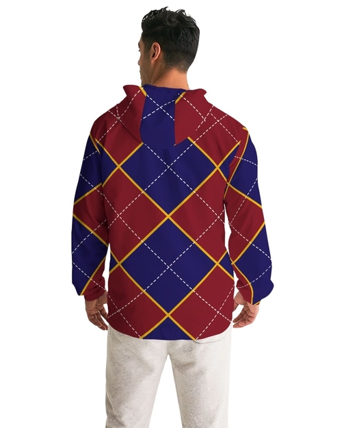Introducing the Men's Windbreaker Jacket in a striking Red and Blue Argyle pattern, designed to keep you comfortable and stylish during windy and rainy days. This jacket is perfect for outdoor activities, casual outings, or simply running errands while ensuring you look your best. Made from lightweight, water-resistant fabric, it provides excellent protection against the elements without compromising on style.