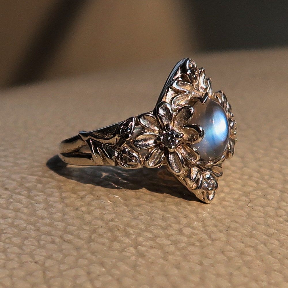 This stunning Moonstone Ring is a beautiful piece of jewelry that features a solitaire flower design with an oval-shaped Moonstone at its center. The Moonstone is surrounded by 8 sparkling cubic zirconia (CZ) stones, adding a touch of brilliance and elegance to the ring. Handmade from high-quality sterling silver, this ring is not only a stylish accessory but also a meaningful gift for her.