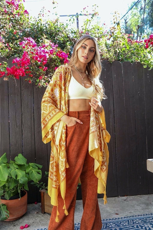 The standout feature of this kimono is its beautiful Moroccan-inspired tapestry print. The intricate patterns and vibrant colors are reminiscent of traditional Moroccan textiles, adding a touch of exotic flair to your outfit. This unique design makes the kimono not just a piece of clothing, but a statement accessory that can transform even the simplest of looks.