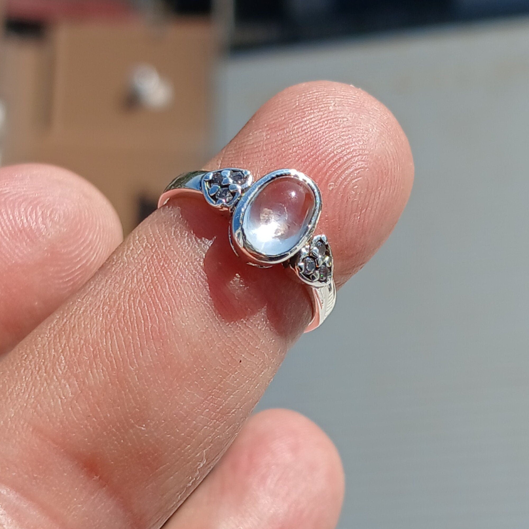 The Natural Moonstone Ring is an exquisite piece of jewelry that captures the essence of elegance and sophistication. Featuring a stunning oval Ceylon Moonstone as its centerpiece, this ring is designed to dazzle and impress. The Moonstone is known for its unique optical phenomenon called adularescence, which gives it a captivating glow that changes with the light. This enchanting gemstone is surrounded by six sparkling cubic zirconia (CZ) stones, adding an extra layer of brilliance and charm to the overall design.
