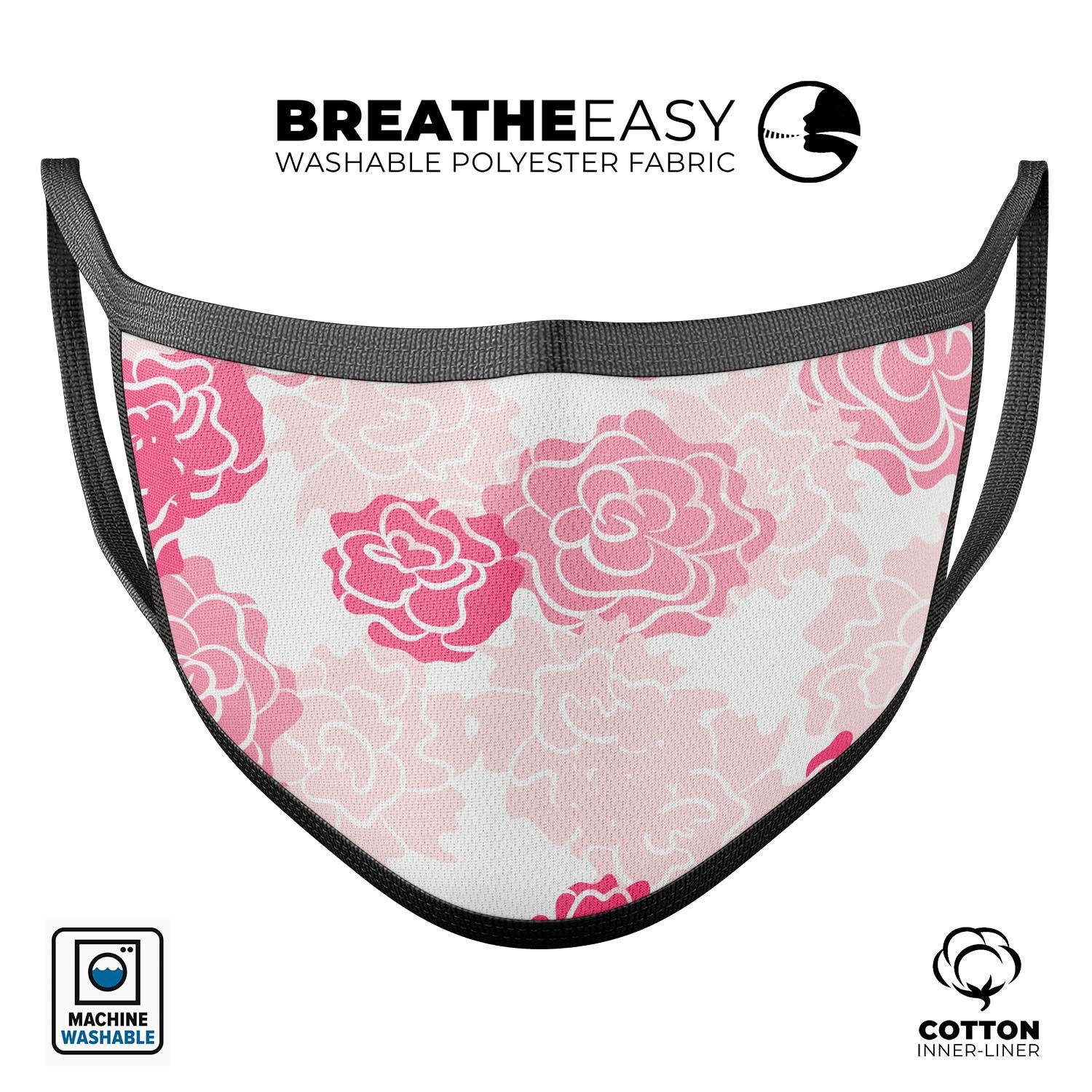 Our Pale Pink and Red Cartoon Roses mouth cover is not only stylish but also practical. It is 100% machine or hand washable, making it a sustainable choice for your daily needs. You can wash it as often as you like without worrying about fading, thanks to our special dye-sublimation printing technique. This ensures that the vibrant colors and intricate designs remain intact, allowing you to enjoy your mask for a long time.