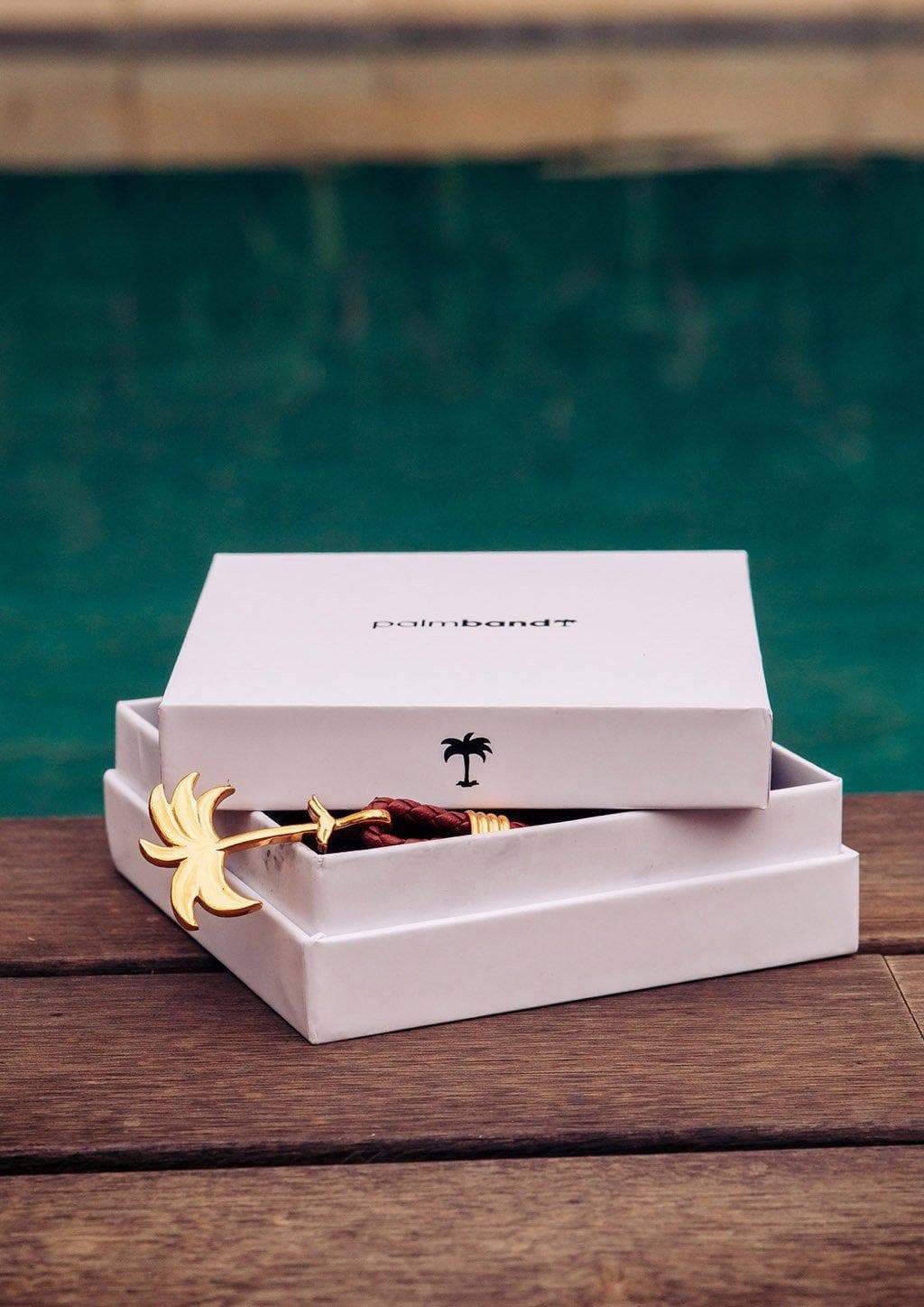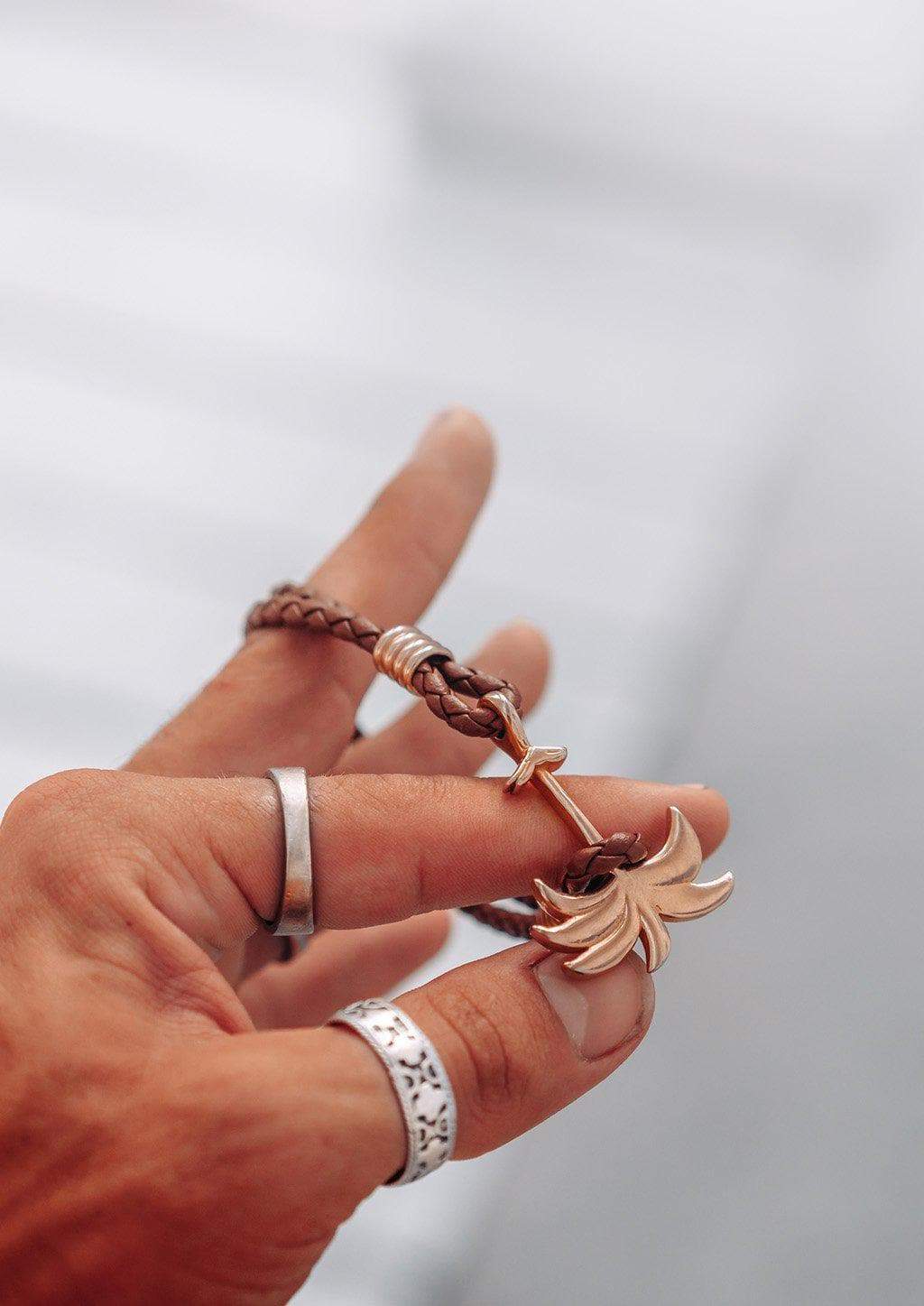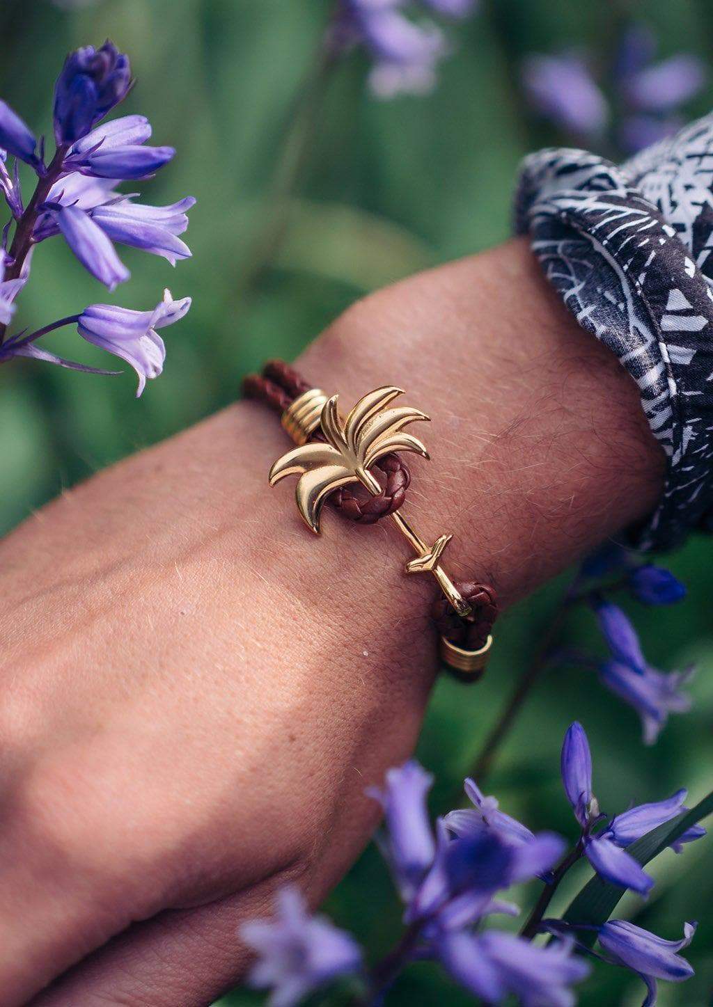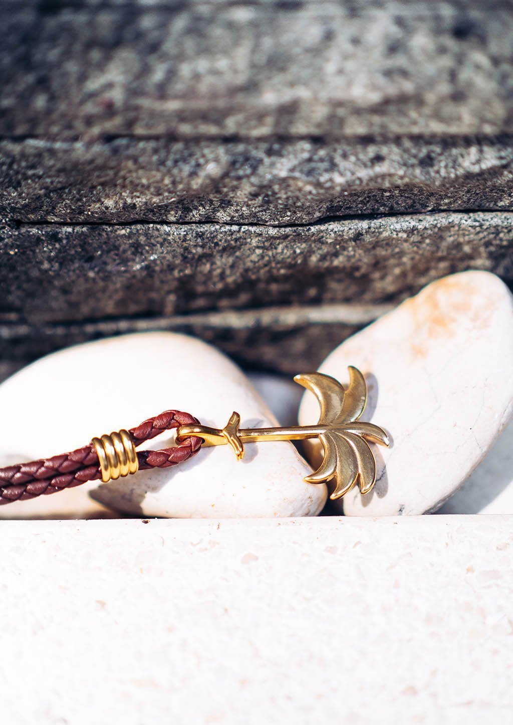 Palm Band - Sunrise Gold featuring a gold palm tree anchor on a thick braided brown leather bracelet, symbolizing positivity and happiness.