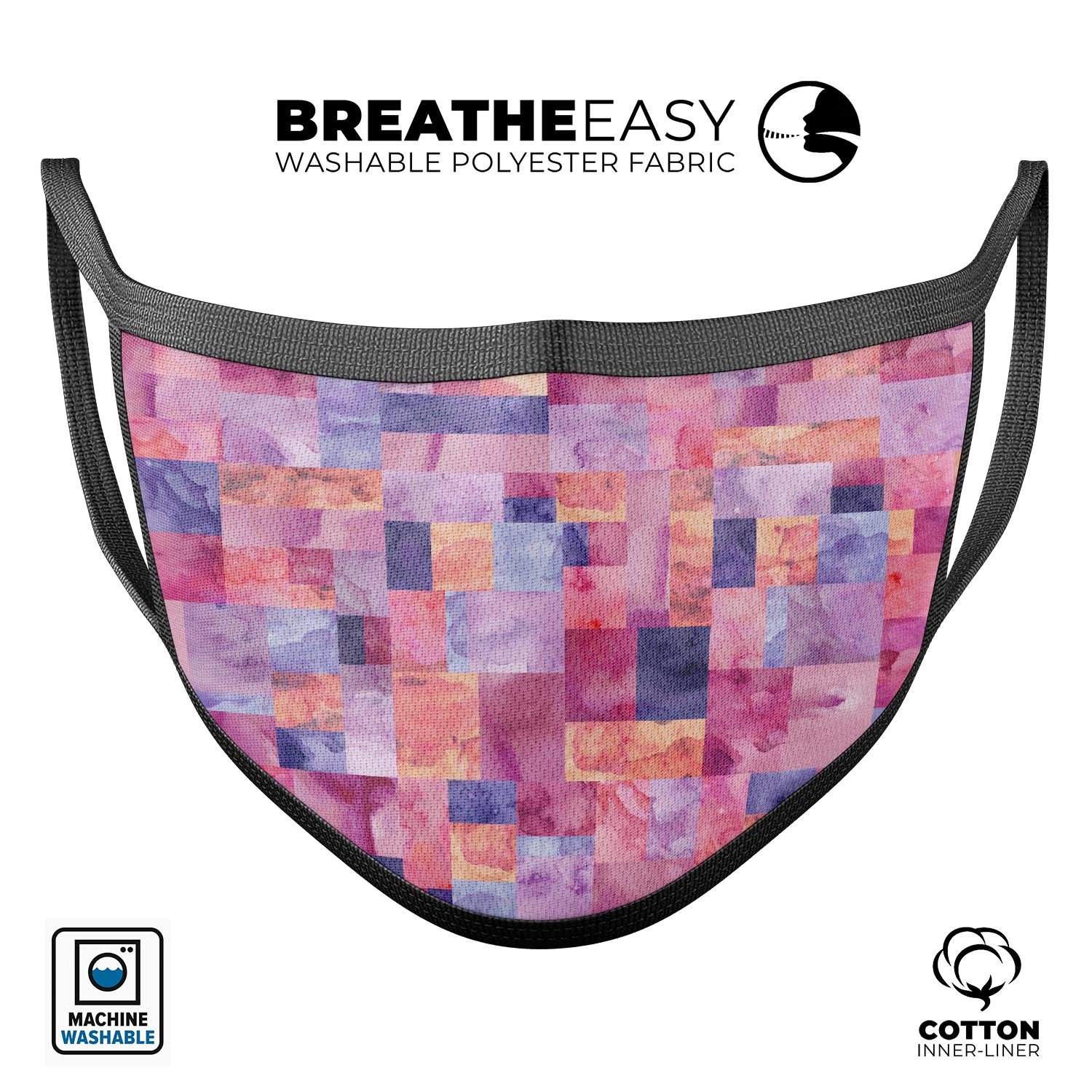 Our Purple and Pink Watercolor Patchwork mouth cover is designed for convenience. It is 100% machine or hand washable, making it easy to maintain hygiene. You can wash it as often as needed without worrying about the design fading, thanks to our special dye-sublimation printing technique. This means you can enjoy a fresh and clean mask every time you wear it.