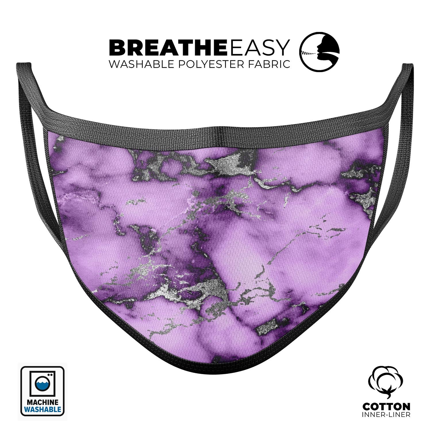 Purple Marble & Digital Silver Foil V6 mouth cover, showcasing a vibrant design with adjustable ear loops for a comfortable fit.