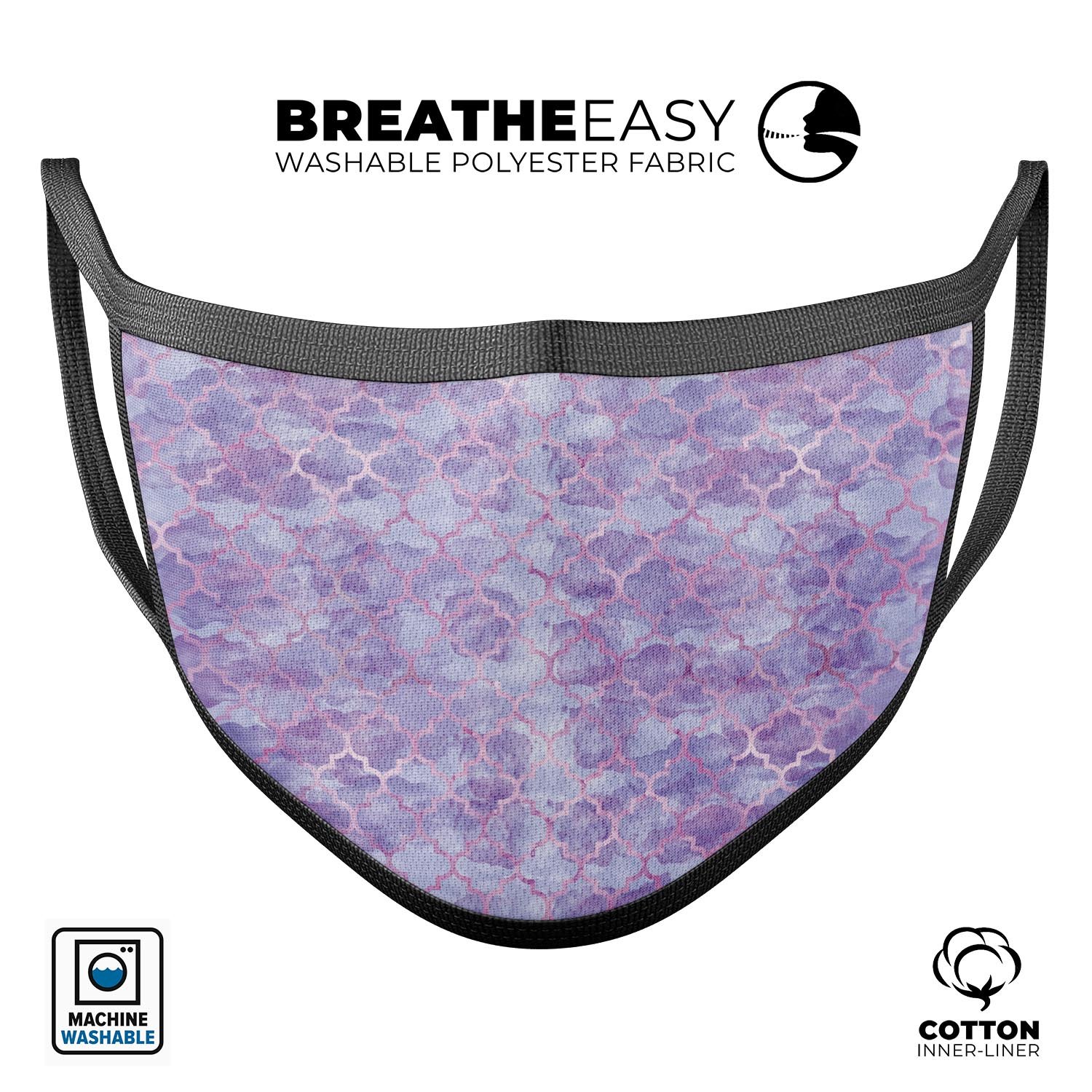 Purple Watercolor Quatrefoil mouth cover, showcasing a vibrant design with adjustable ear loops, made from soft cotton and memory foam.