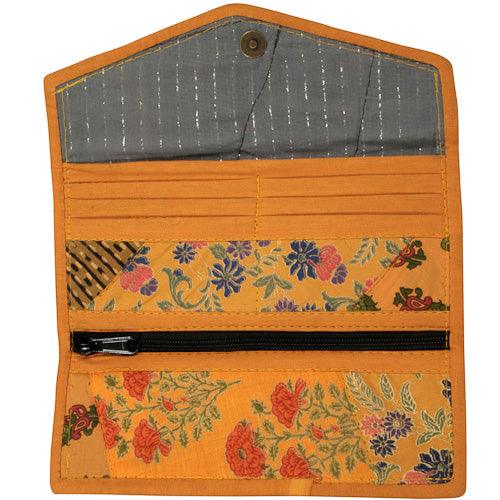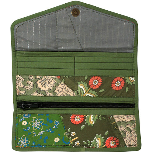 The clutch measures 3-1/2” x 8-1/2” when closed and opens up to 10-1/4” x 8-1/2”, providing ample space for your essentials. It features three card slots, a zipper pocket for coins, and a billfold compartment, making it a practical choice for anyone on the go. The thoughtful design ensures that your bills and coins stay organized and secure, while the stylish patchwork adds a touch of flair to your outfit.