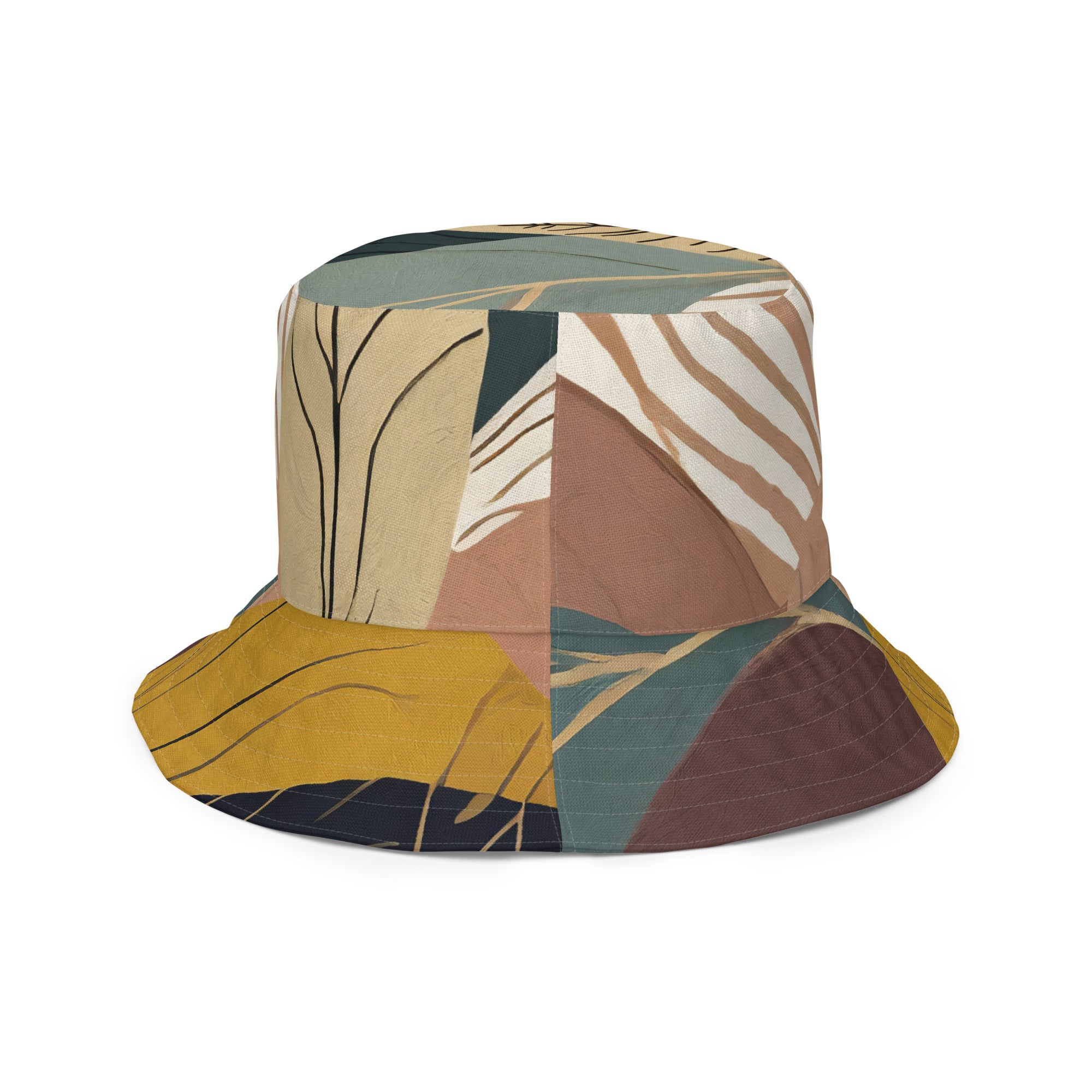 Reversible bucket hat featuring a boho style print, showcasing its dual-sided design and wide brim for sun protection.