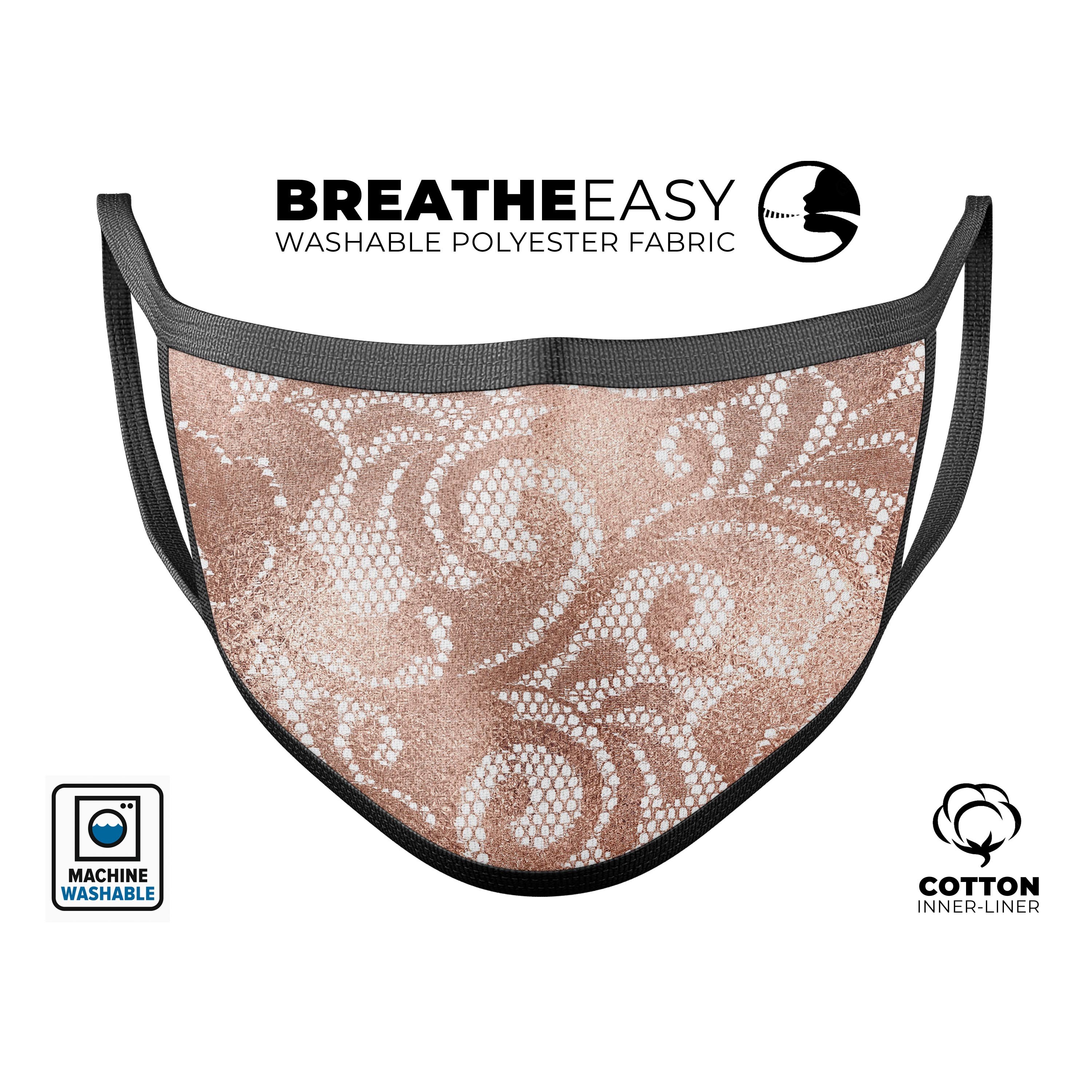 Rose Gold Lace Pattern 14 mouth cover, showcasing a stylish design with adjustable ear loops for a comfortable fit.