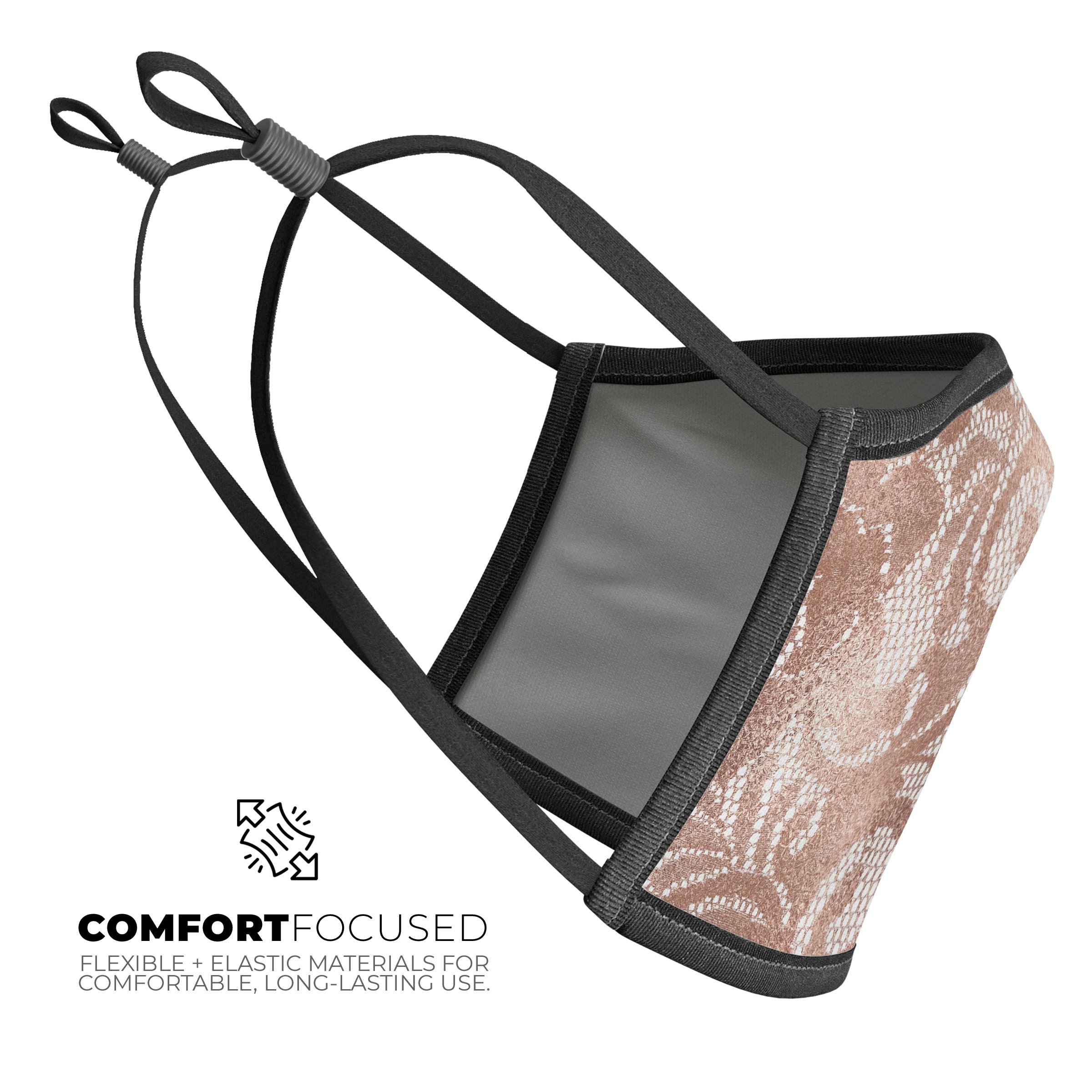 Our Dye-Sublimated reusable 3D face mask is designed for convenience. It is 100% machine or hand washable, making it easy to maintain hygiene. Each mask is completely reusable, allowing you to wash it as often as needed without worrying about fading. The special dye-sublimation technique used in printing ensures that the vibrant rose gold lace design remains intact, even after multiple washes.
