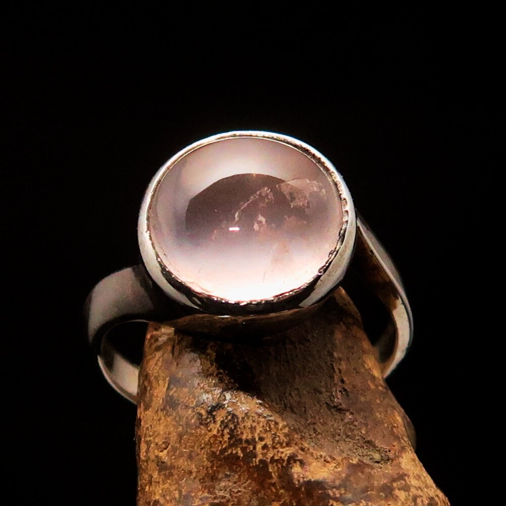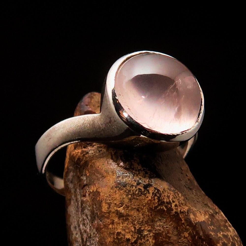 The centerpiece of this ring is a 10 mm round Rose Quartz cabochon, known for its calming and soothing properties. Rose Quartz is often referred to as the stone of love, making this ring a thoughtful gift for a loved one or a special treat for yourself. Its gentle pink color radiates warmth and compassion, making it a perfect addition to any jewelry collection.